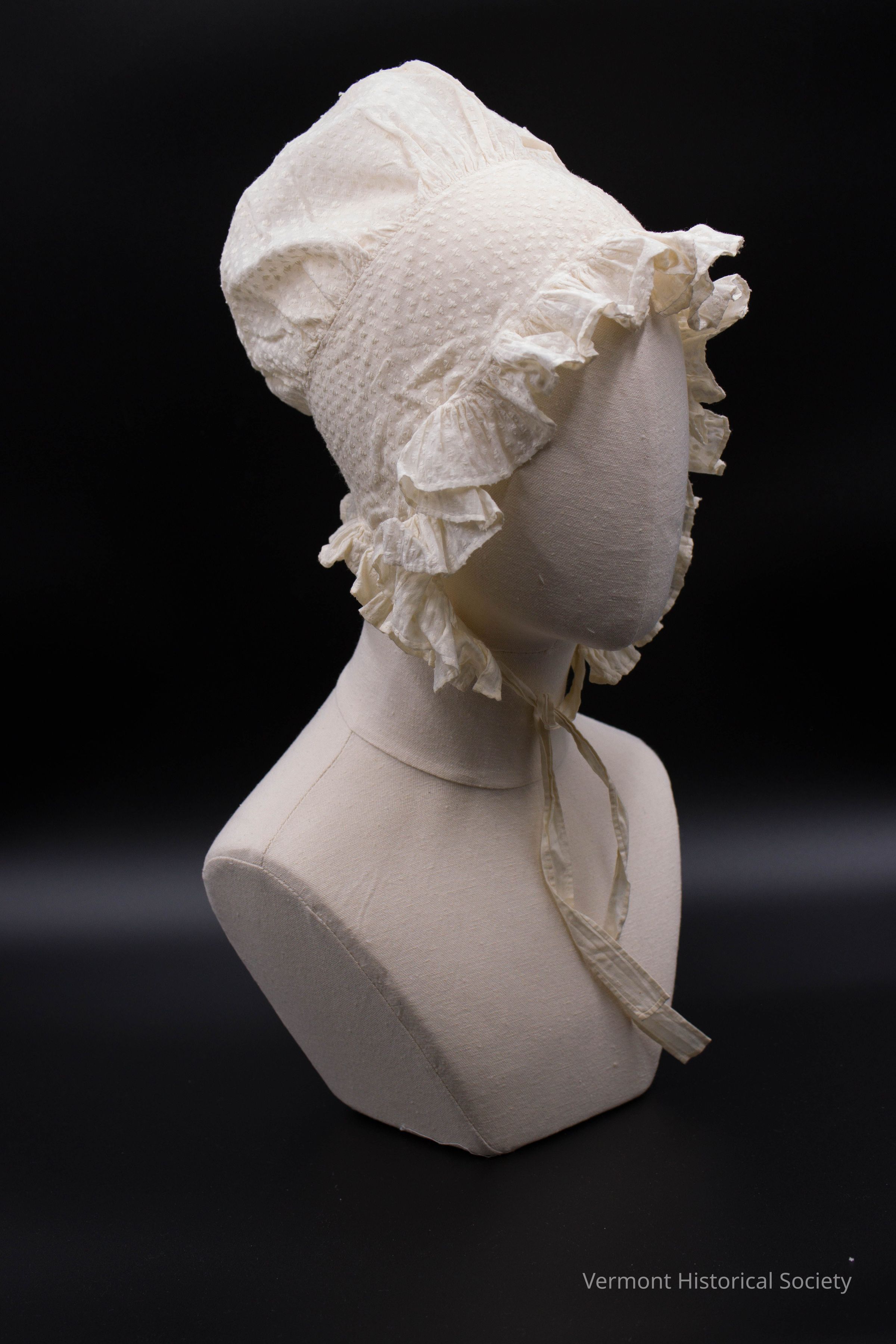 Semi-sheer white cotton cap. The cap is made from finely woven cotton with a float pattern forming small dots. The cap is made in two parts: the crown and brim. The crown is gathered into small pleats to the brim all the way around, and is cut wide, allowing for volume. There is a self-fabric ruffle pleated around the entire edge. There is a narrow drawstring along the base of the crown. A cotton tie is attached to each bottom corner of the brim. There are no traces of starch.Context