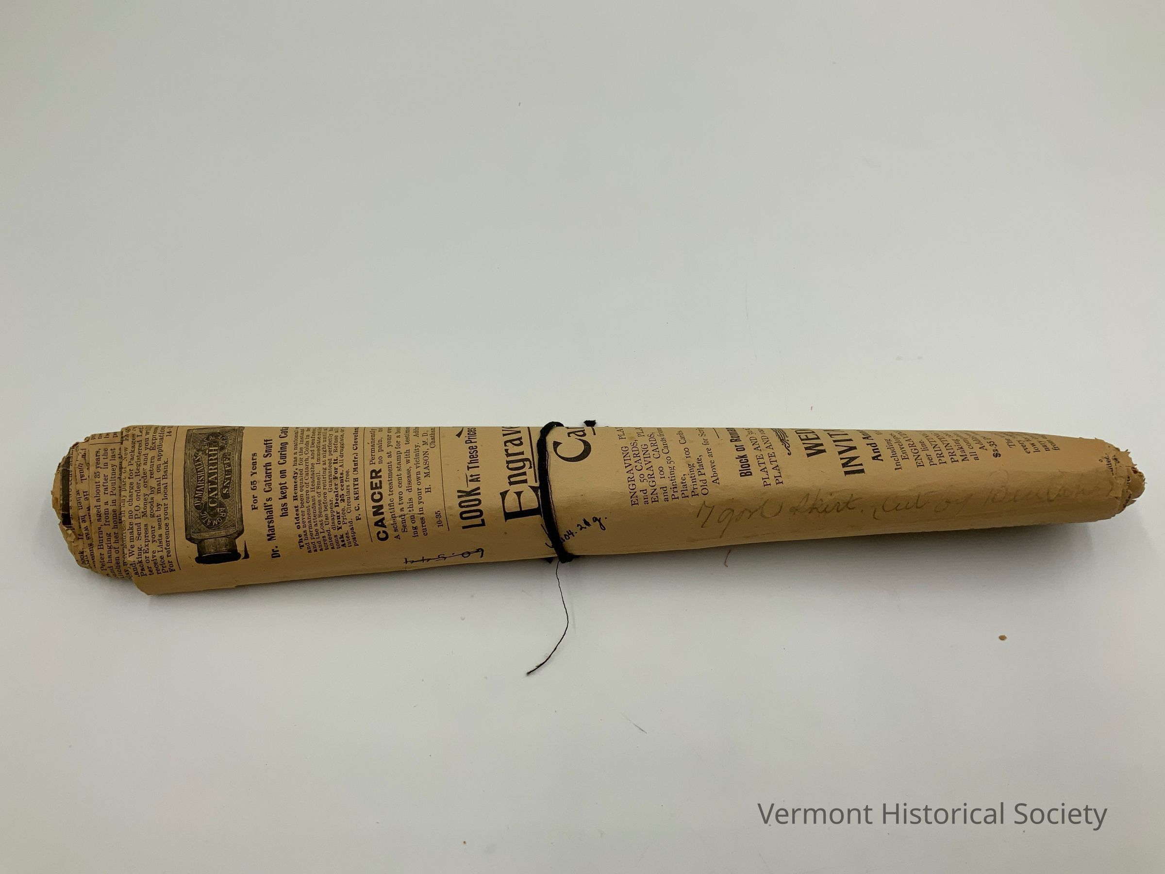 Sewing pattern cut from a newspaper. The pattern pieces are folded, then rolled together and tied with a strip of black cotton. The outermost piece is labeled in pencil, "7 gore skirt (cut by Beulah's)", along one edge.