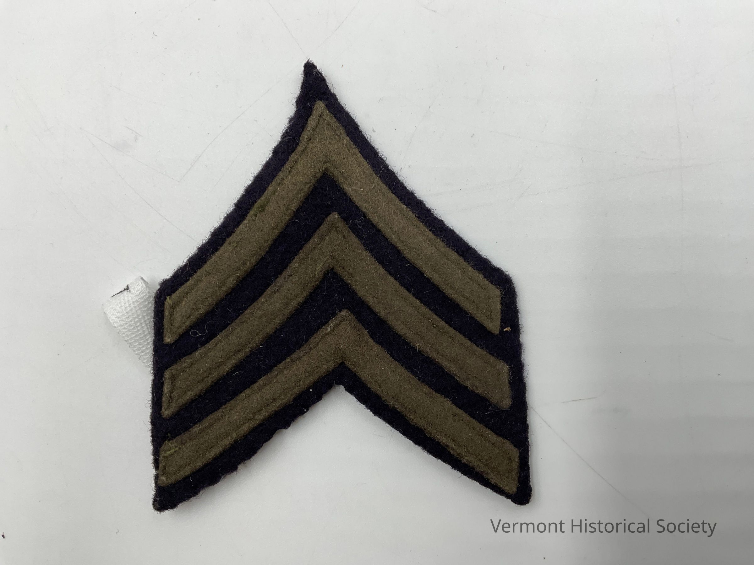 Three green-stripes on a black patch that signifies the rank of sergeant in the U.S. Army.Context