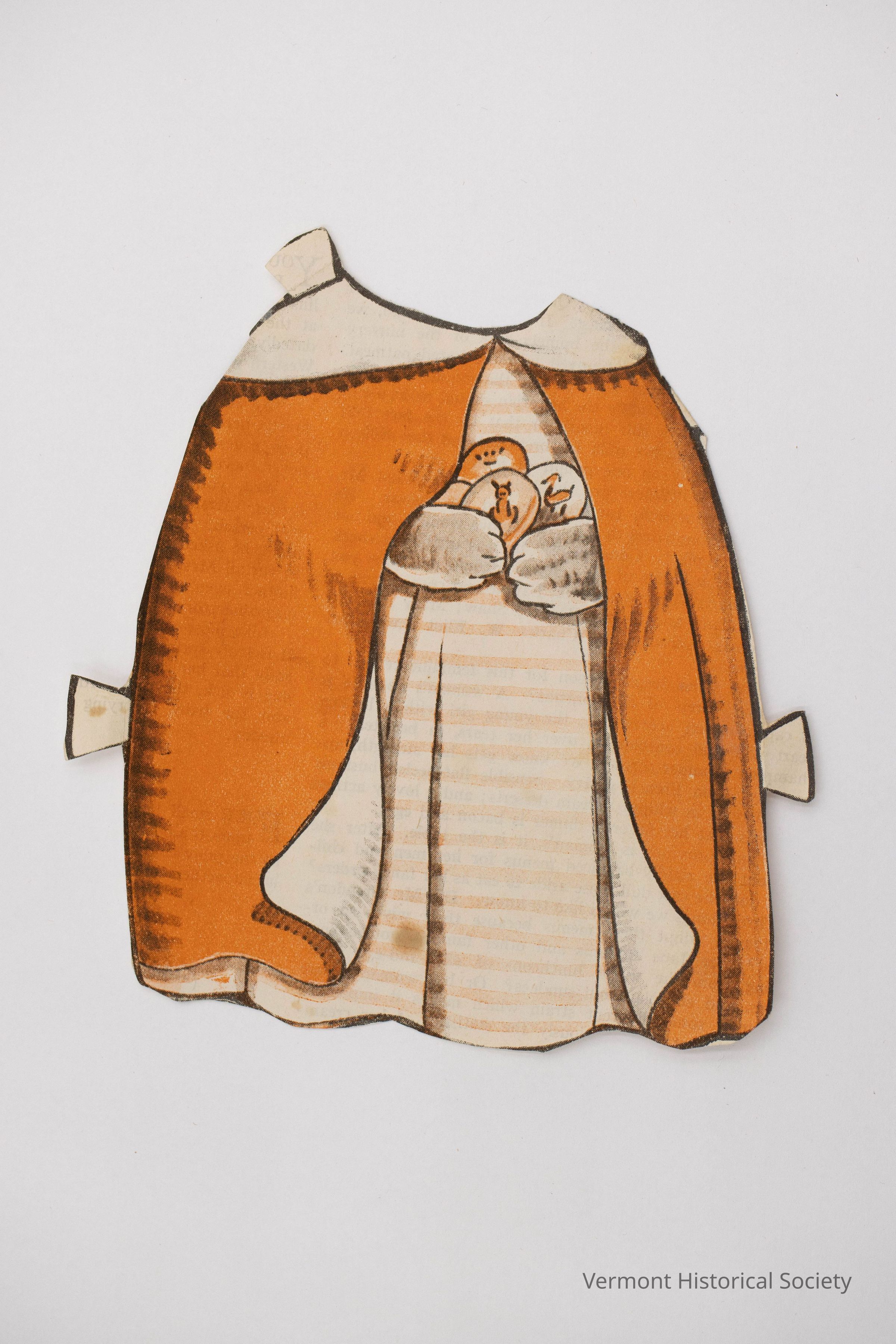 Printed paper cape for a paper doll. The cape is orange with a white dress beneath. Two gloved hands at the center are holding circles printed with animals. The back shows a portion of a magazine article.Context