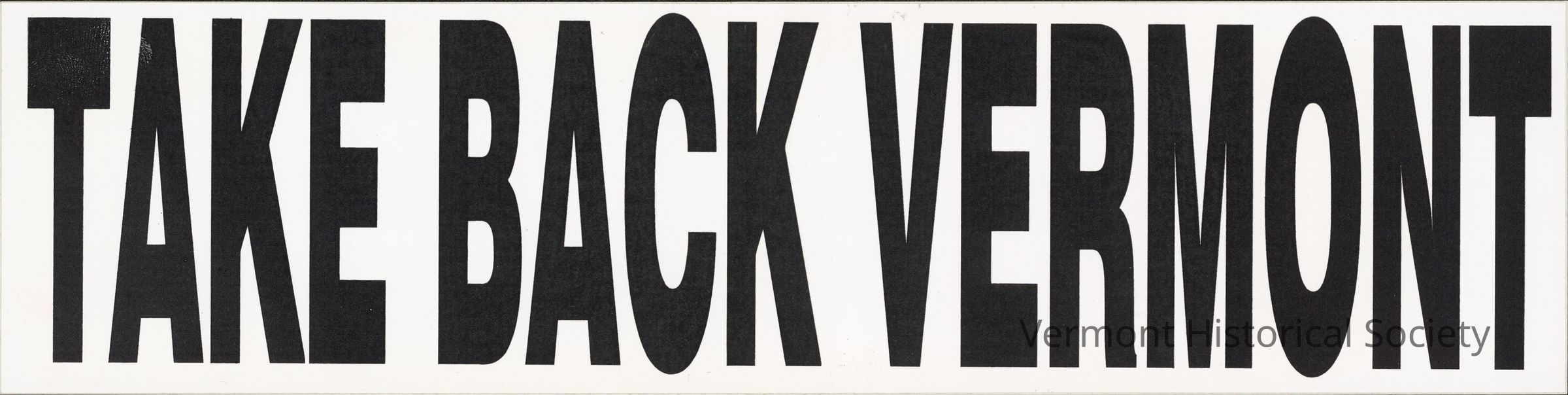 Bumper sticker with black text "TAKE BACK VERMONT" on white backgroundContext