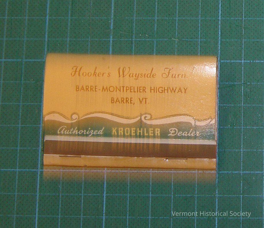 Golden-colored matchbook. The front cover is inscribed, "Hooker's Wayside Furn. / BARRE-MONTPELIER HIGHWAY / BARRE VT." in a dark gold. Below is a decorative furniture scrollwork design in white with green below. Over the green are the words "Authorized KROEHLER Dealer" in white script and yellow block lettering. The back cover shows a green couch and the words "Styled by KROEHLER" in brown and white. Printed along bottom edge are the words, "Universal Match Corp., Chicago."Context