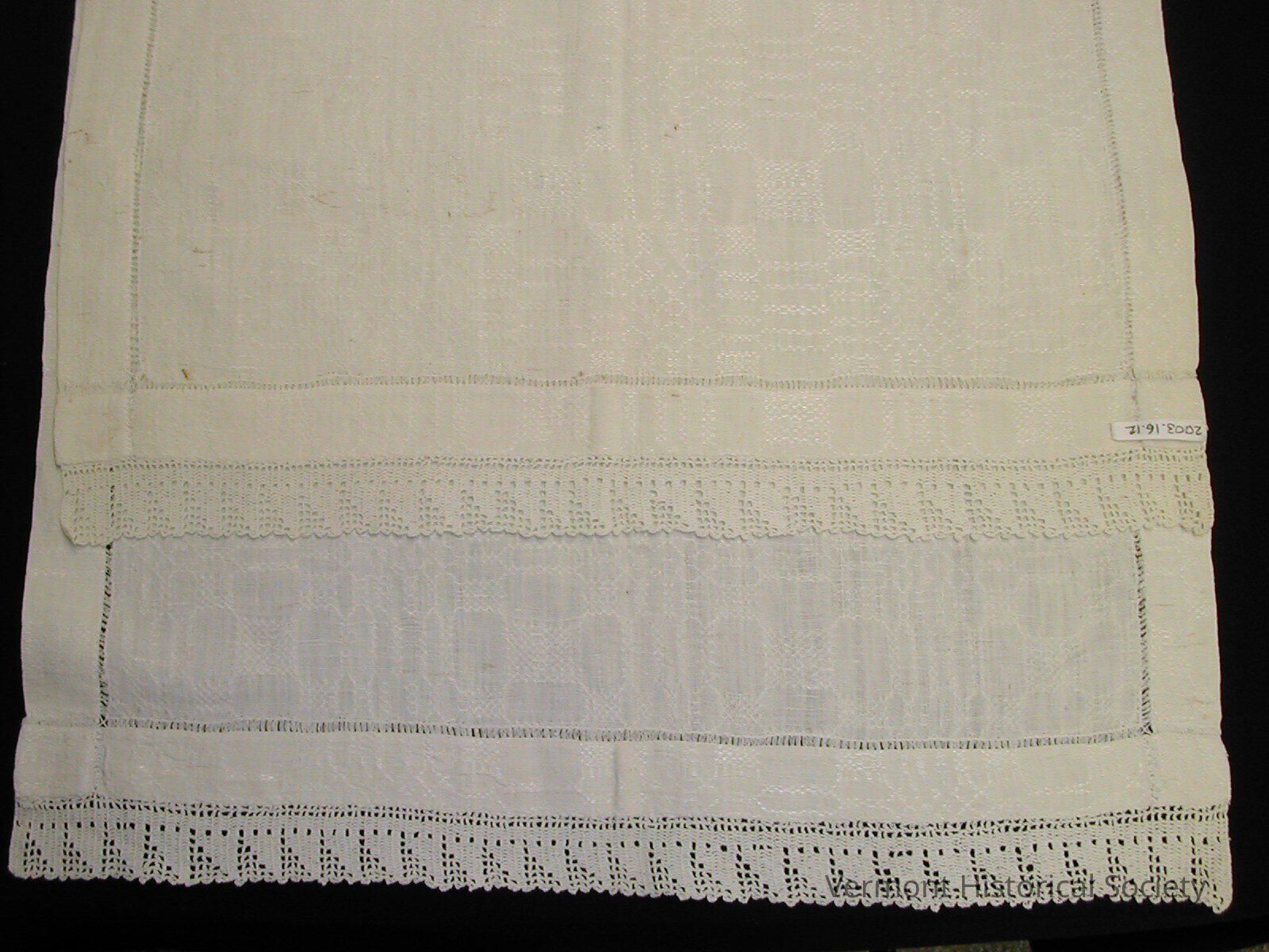 White linen bureau scarf with 1-1/2" wide crocheted lace on the two short ends. It is woven in a spot weave with single-ply linen. It has a 1-1/2" hem on all sides with openwork hem stitching.