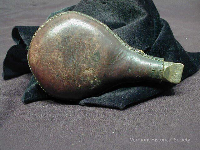 Brown leather powder flask. The flask is teardrop shaped and sealed with a carved wooden tab.