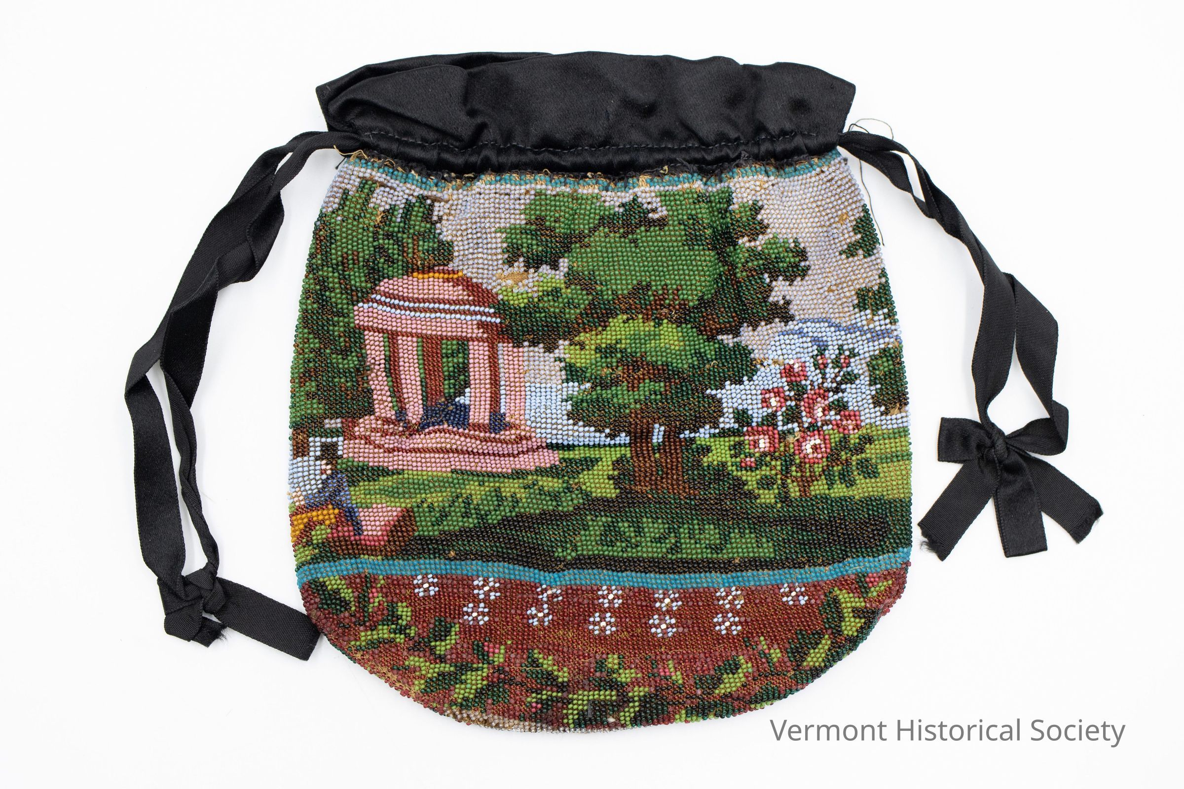 Small beaded drawstring bag. The body of the bag is loom beaded in an intricate scene that wraps around the entire bag without repeat. One side shows a woman holding a lamb with a sheep on a leash. She is in front of a large pink monument, and 2 doves are flying above the monument with a wreath. There is a tree and a berry bush behind the woman. That vignette is in front of a body of water. A village and mountains are visible on the far shore. The other side shows a pink temple beside a large tree and a rose push. There is a man seated at a table below the temple. The base of the bag is beaded with a red ground, small white flowers, and a green vine. The top ruffle and drawstring are black silk. There is a label that reads, "Made by Betsy Cadwell of Montpelier, and given to a friend, Mrs. Mary Dodge Storrs, Montpelier".Context