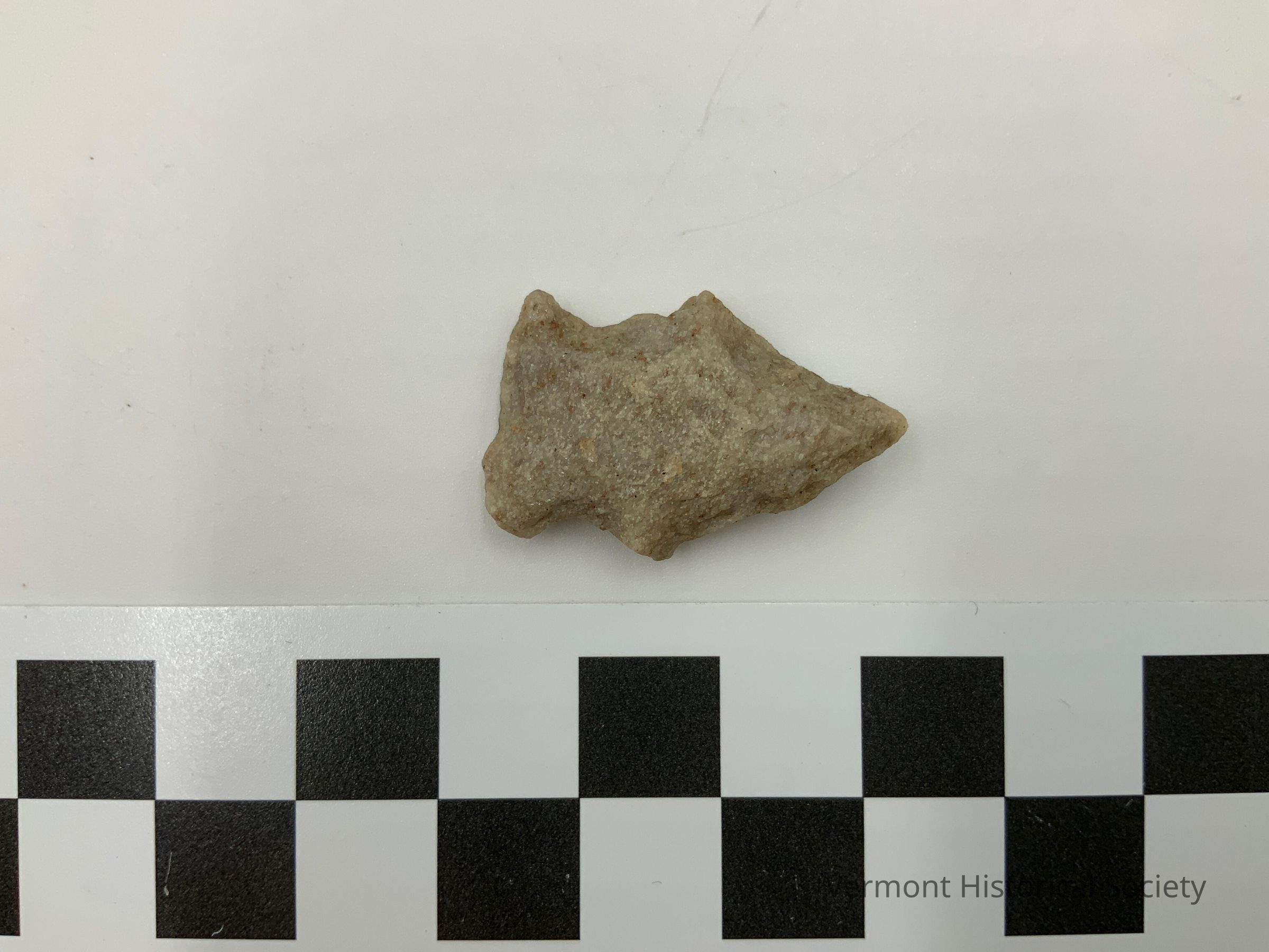 Tan-colored chipped stone projectile point with side notches and incurvate blades.