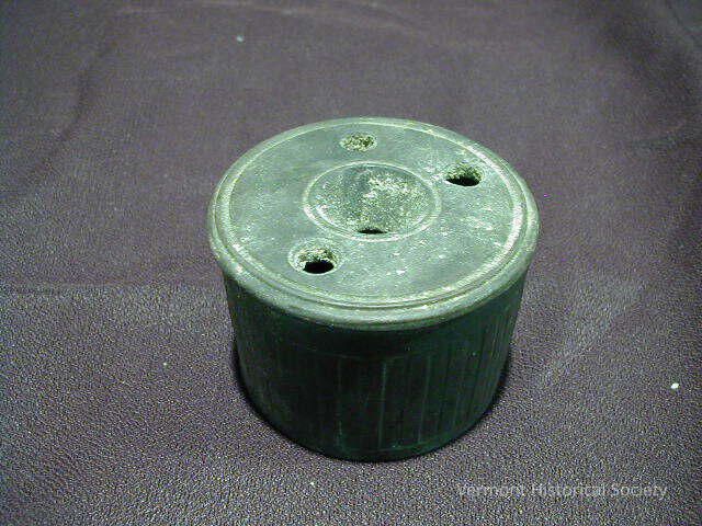 One-piece, cylindrical inkwell with three holes located on the outer rim and one hole in the center.