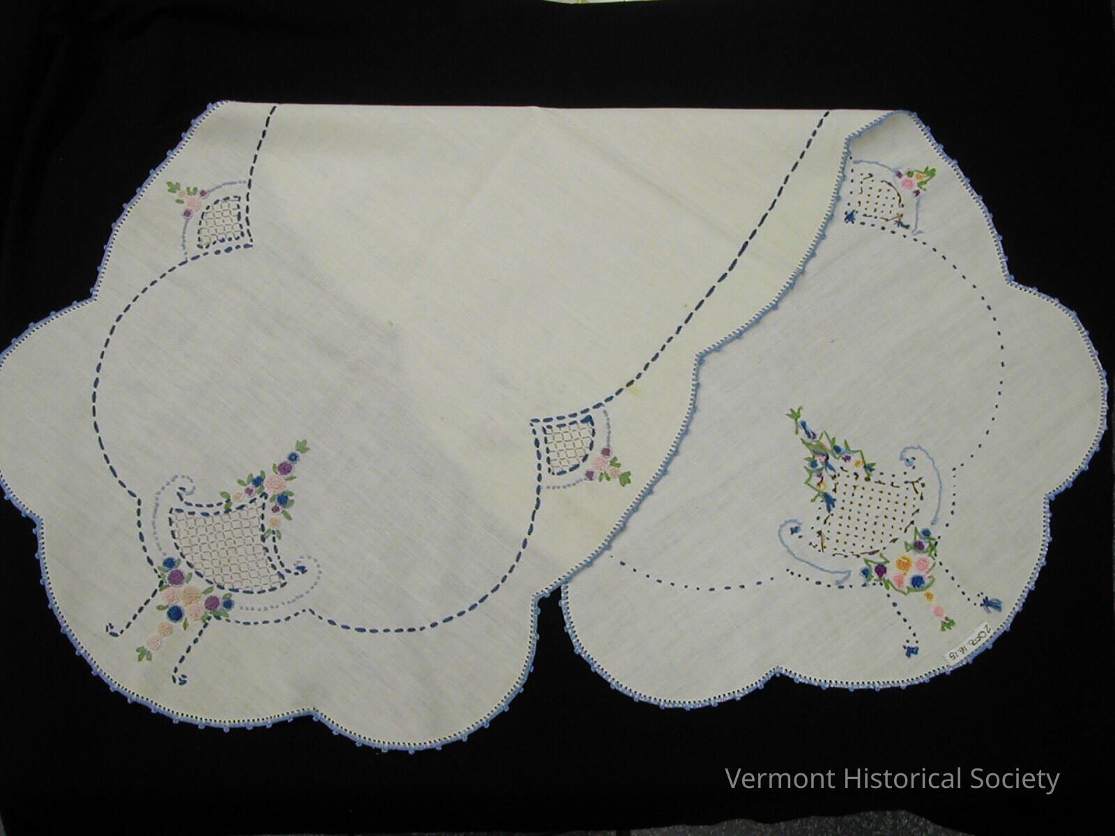The bureau scarf is made of white linen and has an oval shape with large scalloped edges. The embroidery on the scarf is predominantly blue and features stylized flowers in pink, lilac, and peach, made using French knots, and a border of running stitches. The edges of the scarf are finished with a simple blue crocheted edging.Context