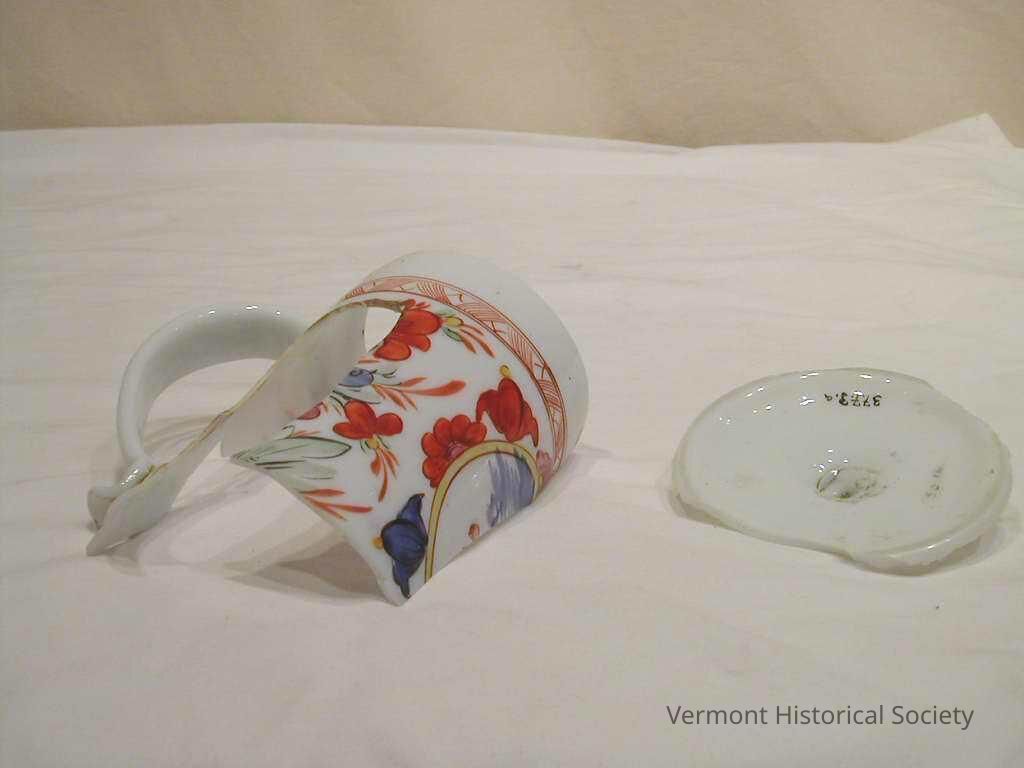 Large white glass tankard painted with a floral design in red, green, and blue. The center of the cup has design inside a round border. The cup is now broken, and two pieces remain.Context