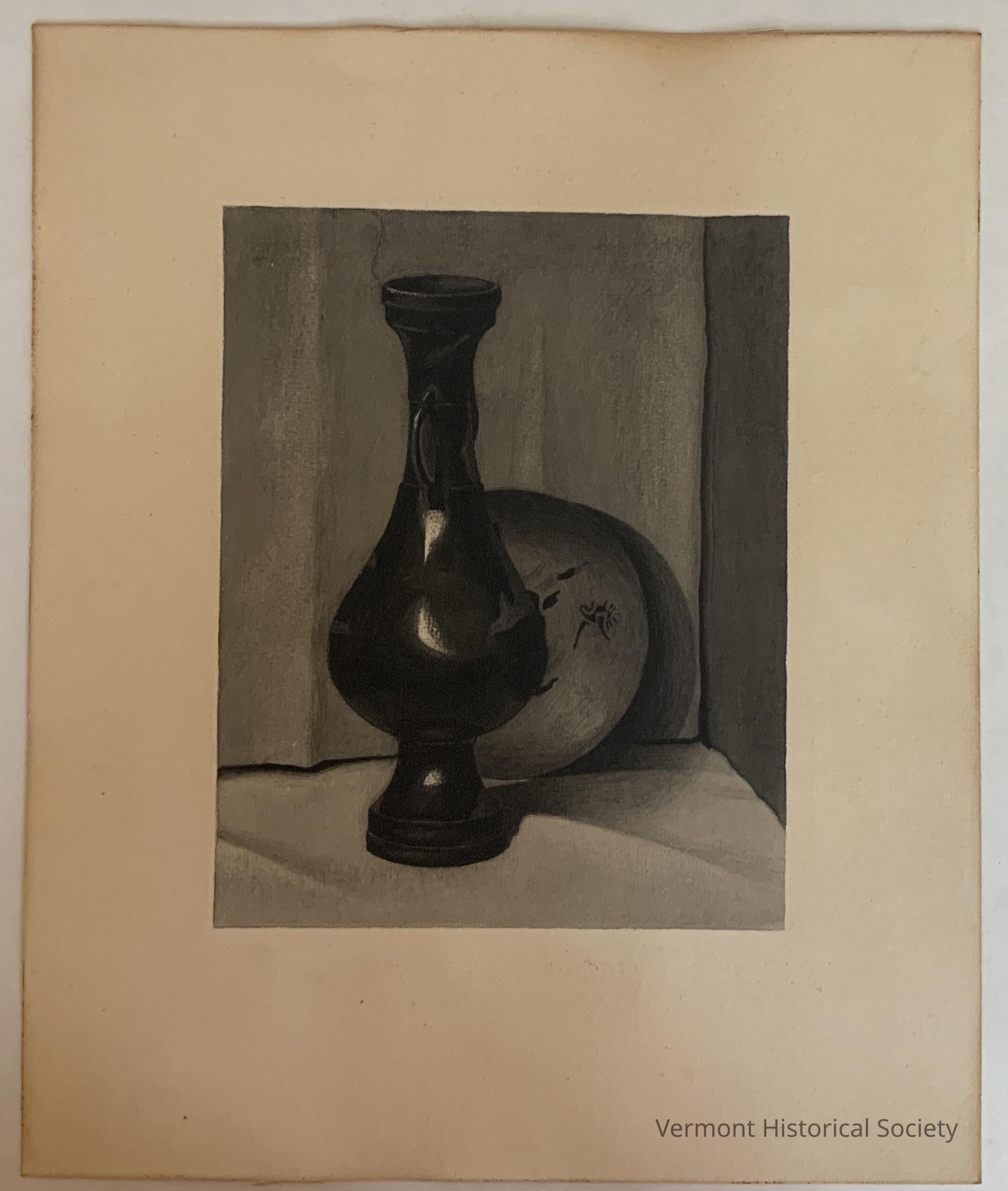 A painting of a vase in front a plate cast in shadow, all in black and white. Unsigned and undated.Acquisition