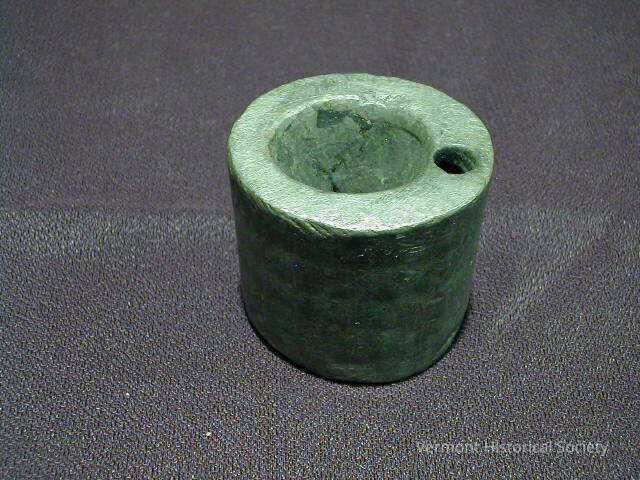 Heavy, cylindrical inkwell. The inkwell has a large, deep hole in the center top, and a smaller hole next to it.