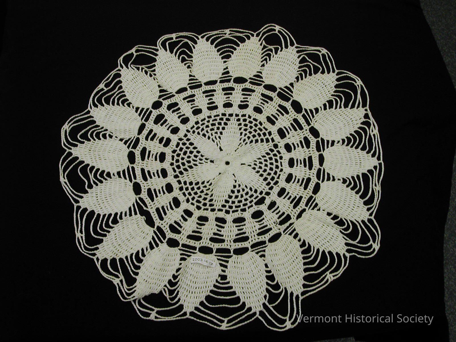 The doily is round and crocheted with white thread. It features a six-petal design in the center surrounded by rounds of double crochet. The outer border of the doily is made in a pineapple design connected by loops of chain stitches.Context