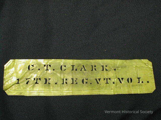 Rectangular brass stencil stamped with the words, "C. T. CLARK. 17TH. REG. VT. VOL." The corners are cut off, and the edges are embossed with a border of two parallel lines.Context