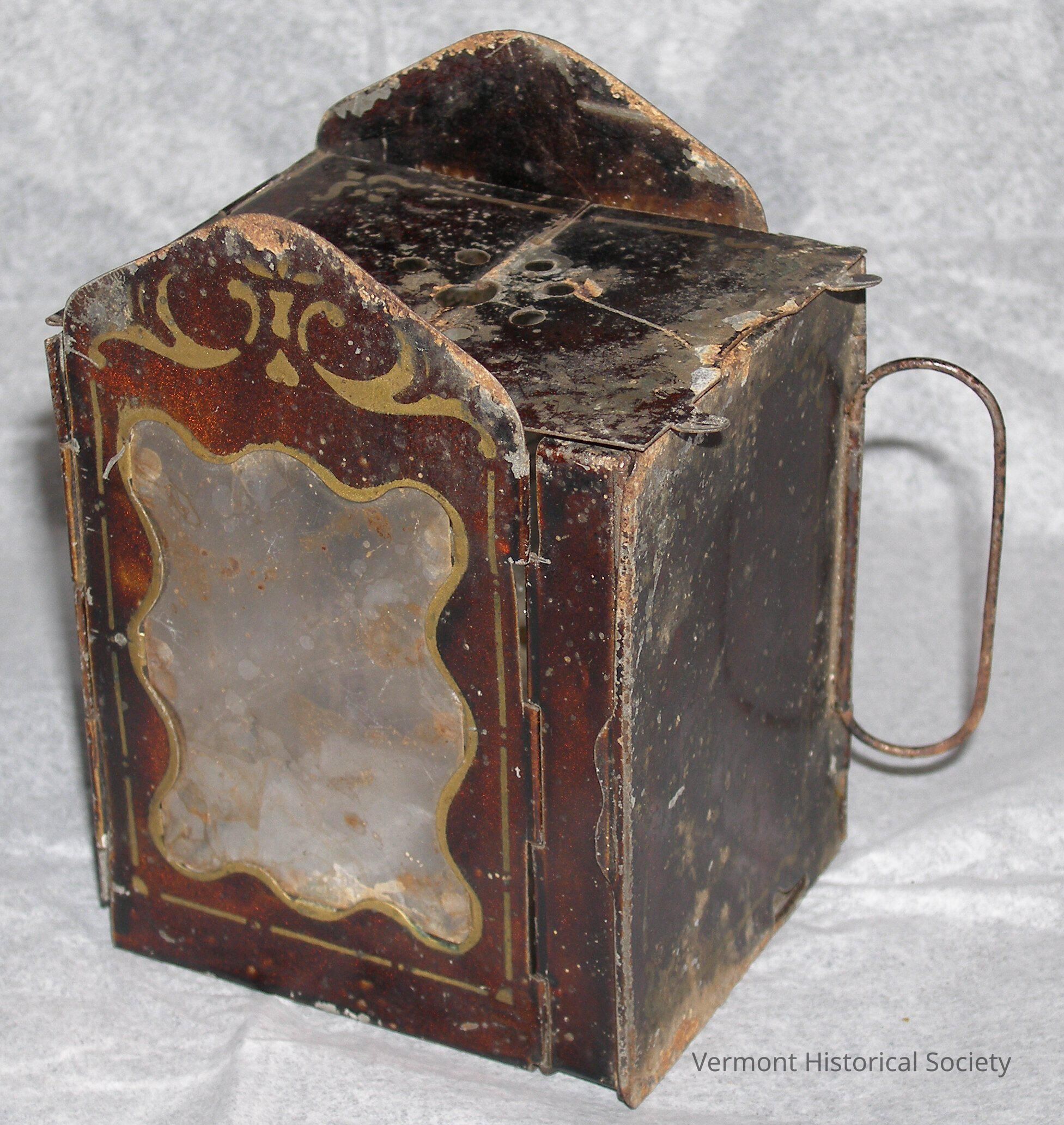 Collapsible dark lantern with a mica window on only side. It has gold stencil decoration, and holder for candle in one corner. There are holes drilled into the center top oriented in the shape of a daisy.