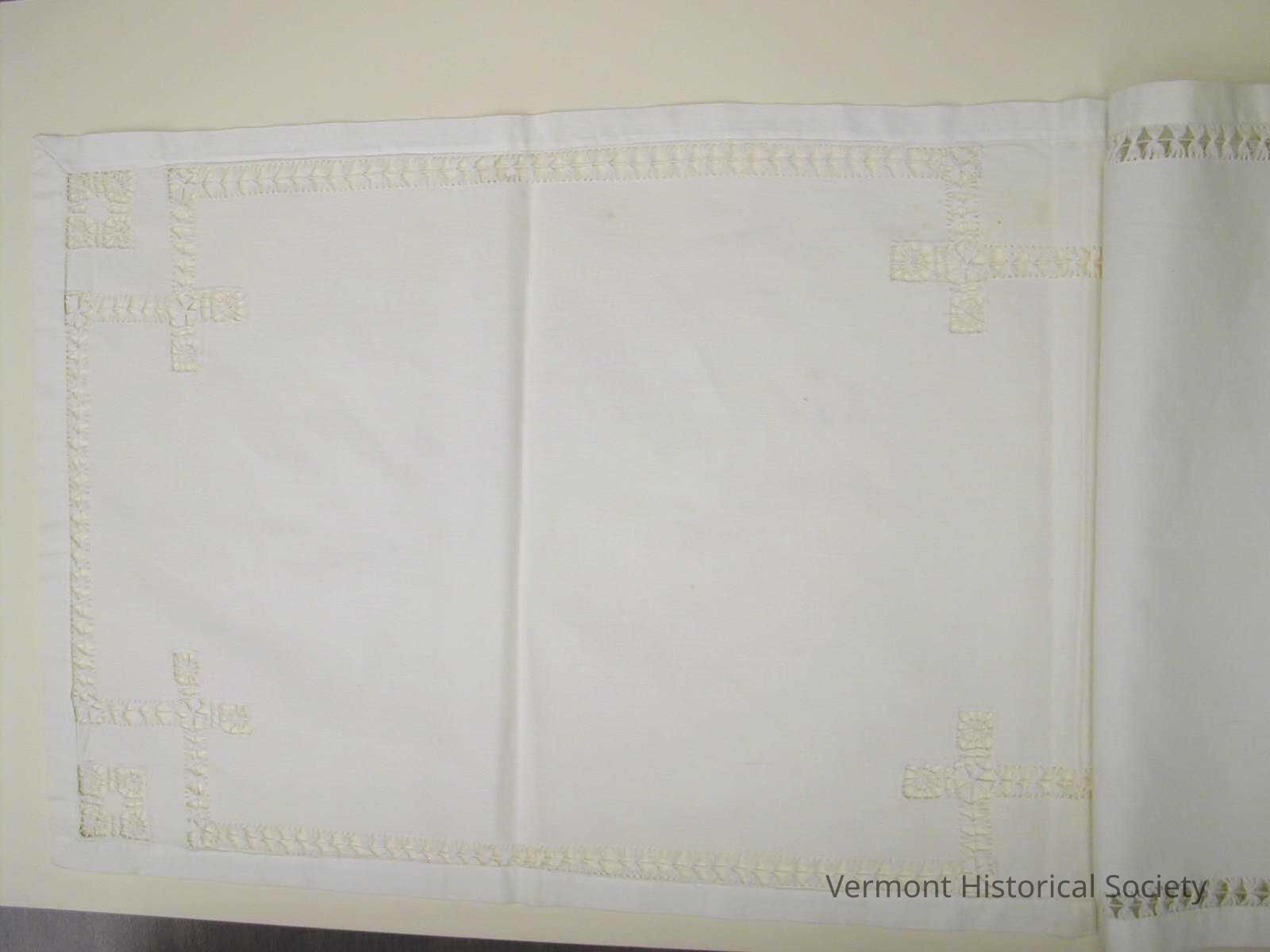 White cotton bureau scarf decorated with cutwork borders.