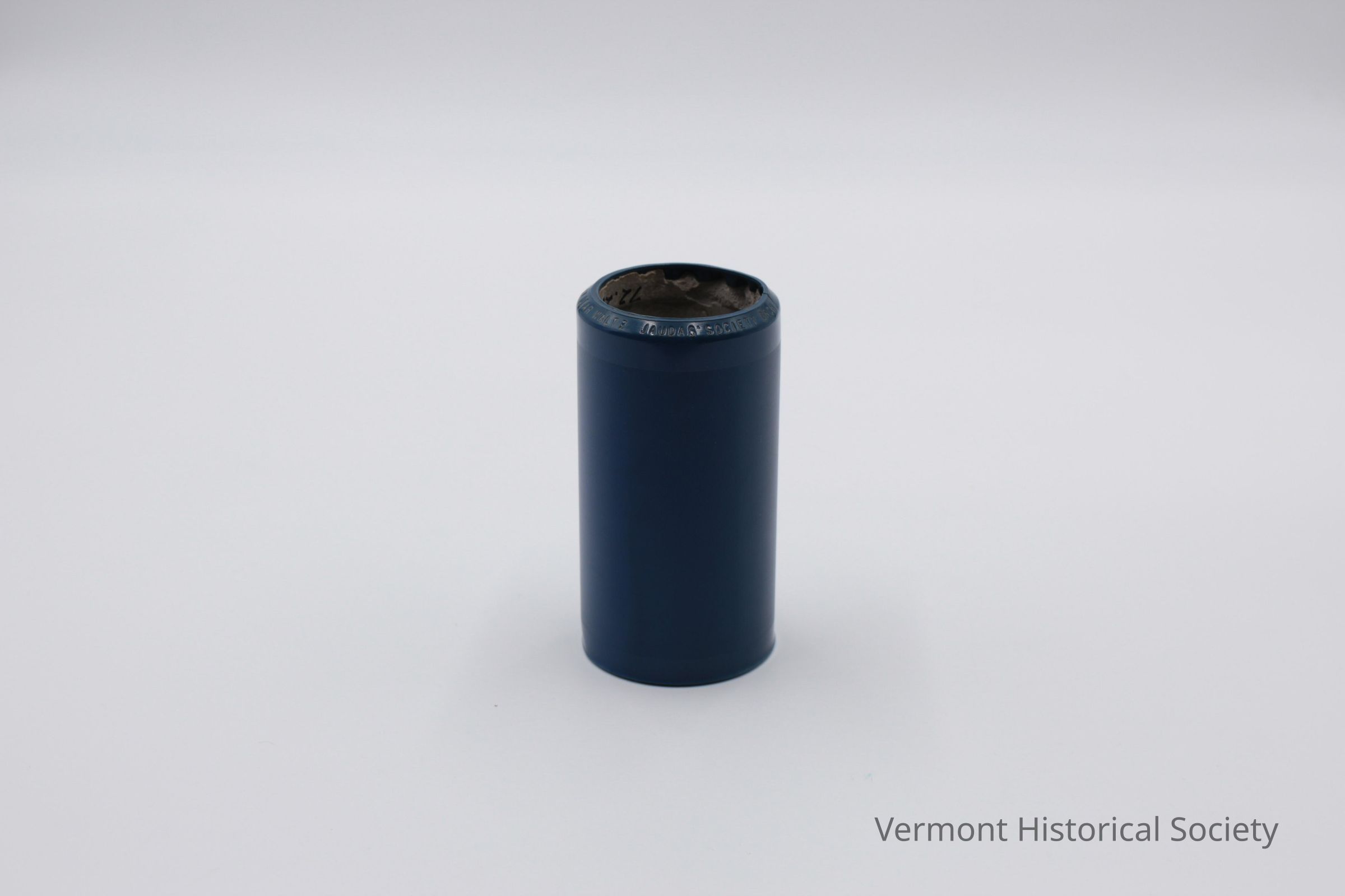 Blue phonograph cylinder with a cardboard case. The cylinder, or "record", is a hollow cylinder consisting of hard, blue, ridged celluloid around a concrete core. One edge of the cylinder is labeled in white with the words, "3278 MOLLY DEAR WALTE JAUDAS' SOCIETY ORCH / Thomas A Edison PAT'D. 24."Use