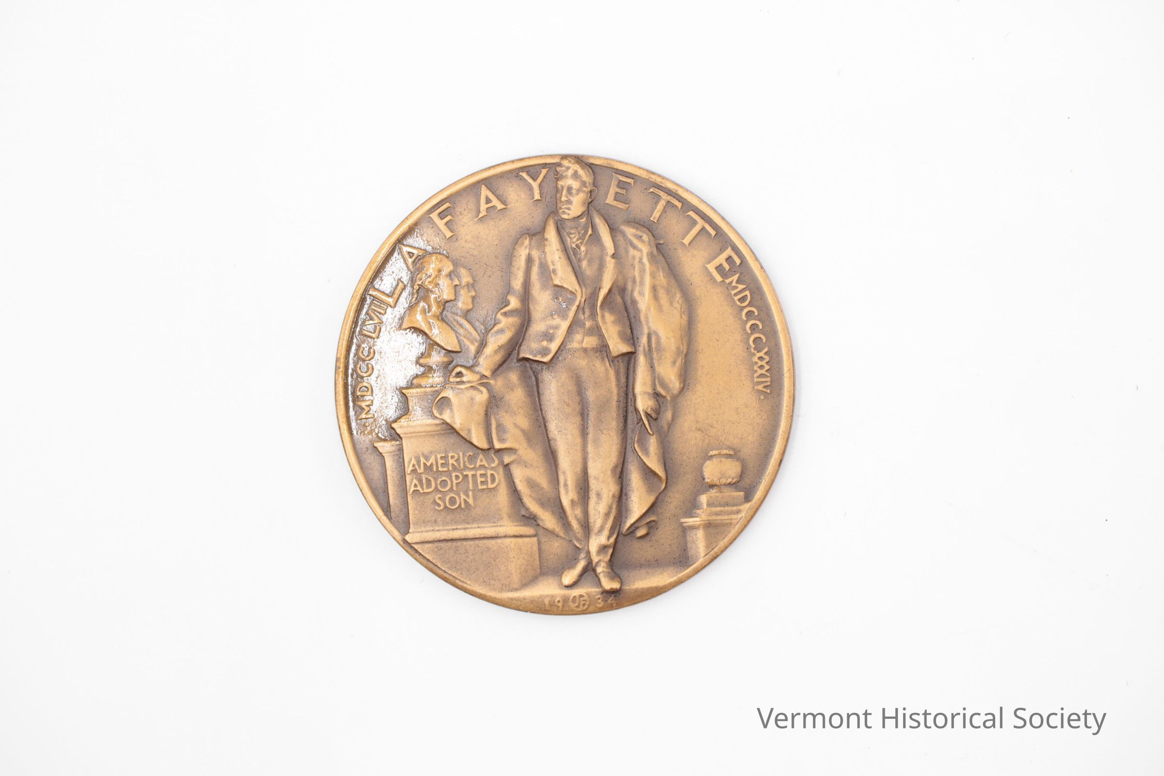 Commemorative medal showing a full-body depiction of a man (Lafayette) standing beside a pedestal holding busts of George Washington and Benjamin Franklin. The inscription, "MDCCLVII LAFAYETTE MDCCXXXIV." rings the edge, and the inscription, "AMERICA'S ADOPTED SON" is on the pedestal. The back shows a sword entwined with a garland of laurel leaves and oak leaves with a palm leaf behind. The inscription, "THE AMERICAN FRIENDS OF LAFAYETTE / MAY XX MCMXXXIV CENTENARY OF HIS DEATH", rings the edge.Context
