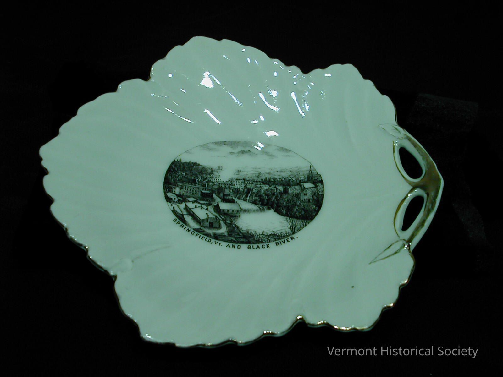 Leaf-shaped candy dish with a printed scene in the center consisting of a town situated around a central river. The image is labeled, "SPRINGFIELD, Vt. AND BLACK RIVER." The bottom is marked, "MADE IN GERMANY FOR C. A. LELAND & SON SPRINGFIELD, Vt."