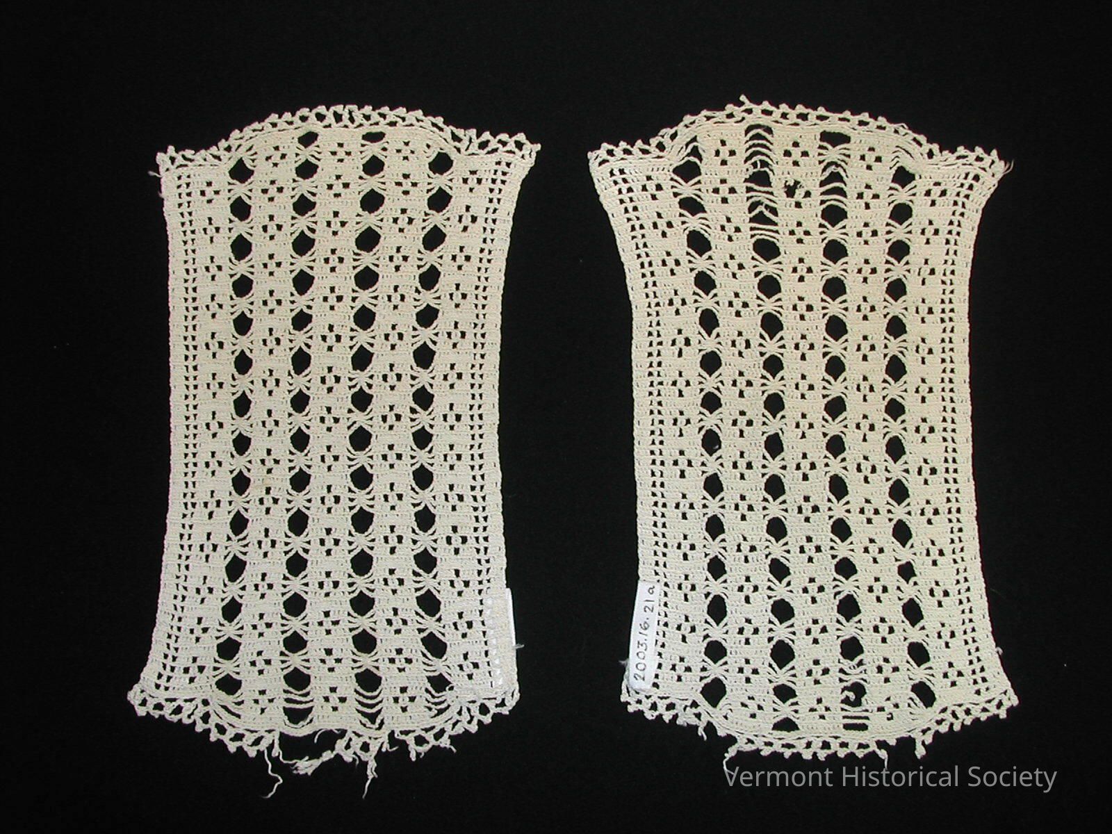 Rectangular crocheted chair arm covers with rounded ends. The crochet is done in a striped pattern alternating diaper patterns with chain-stitched bundles.