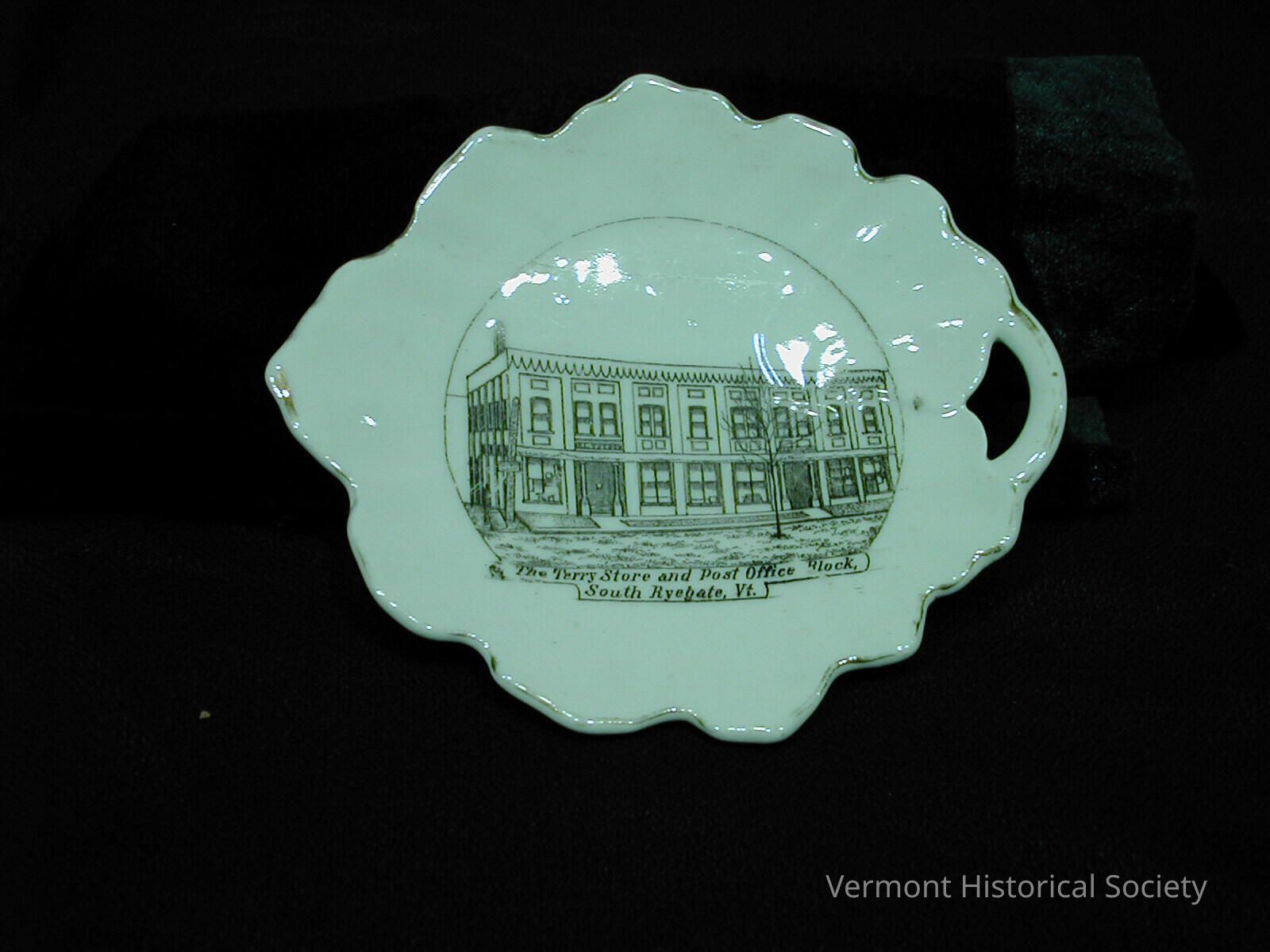 Leaf-shaped candy dish printed with a line drawing of a block of connected city buildings. The image is labeled, "The Terry Store and Post Office Block, South Ryegate, Vt." The bottom of the dish is marked, "Made in Germany for B. L. TERRY South Ryegate, Vt." in red.