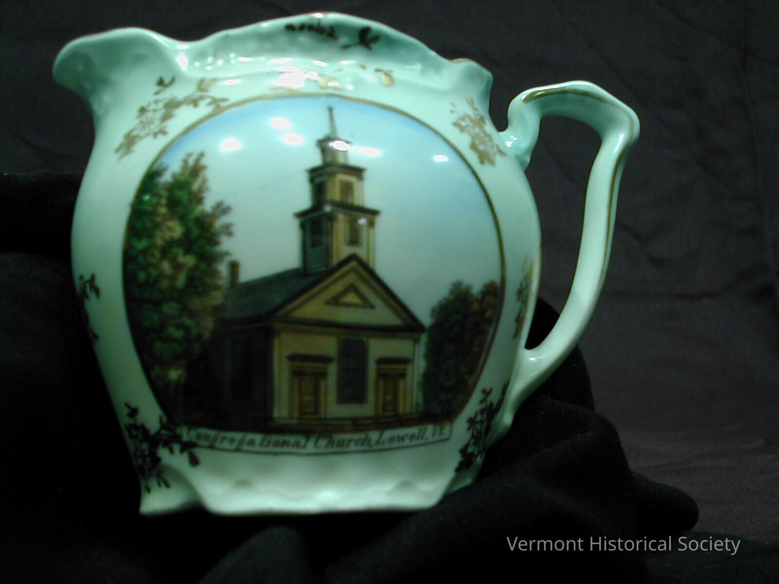 White ceramic cream pitcher. The pitcher has a small handle and bulbous body. The body is decorated all over for gilded flowers, and has a full-color illustration of a church. The image is labeled, "Congregational Church, Lowell, Vt." The bottom is marked, "J. Stephenson Lowell, Vt."