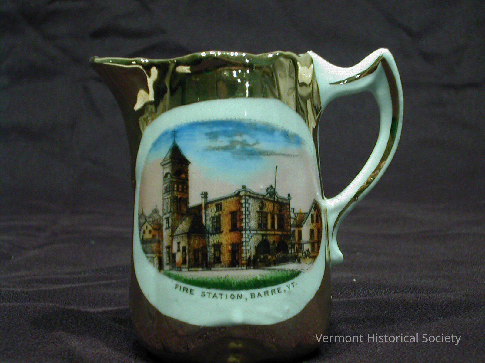Gold-lustered cream pitcher with a full-color illustration of a rectangular brick building with a tall, square tower. The illustration is labeled, "FIRE STATION, BARRE, VT." The bottom of the pitcher is marked, "MADE IN GERMANY FOR C. N. Kenyon & Co. Barre, Vt."