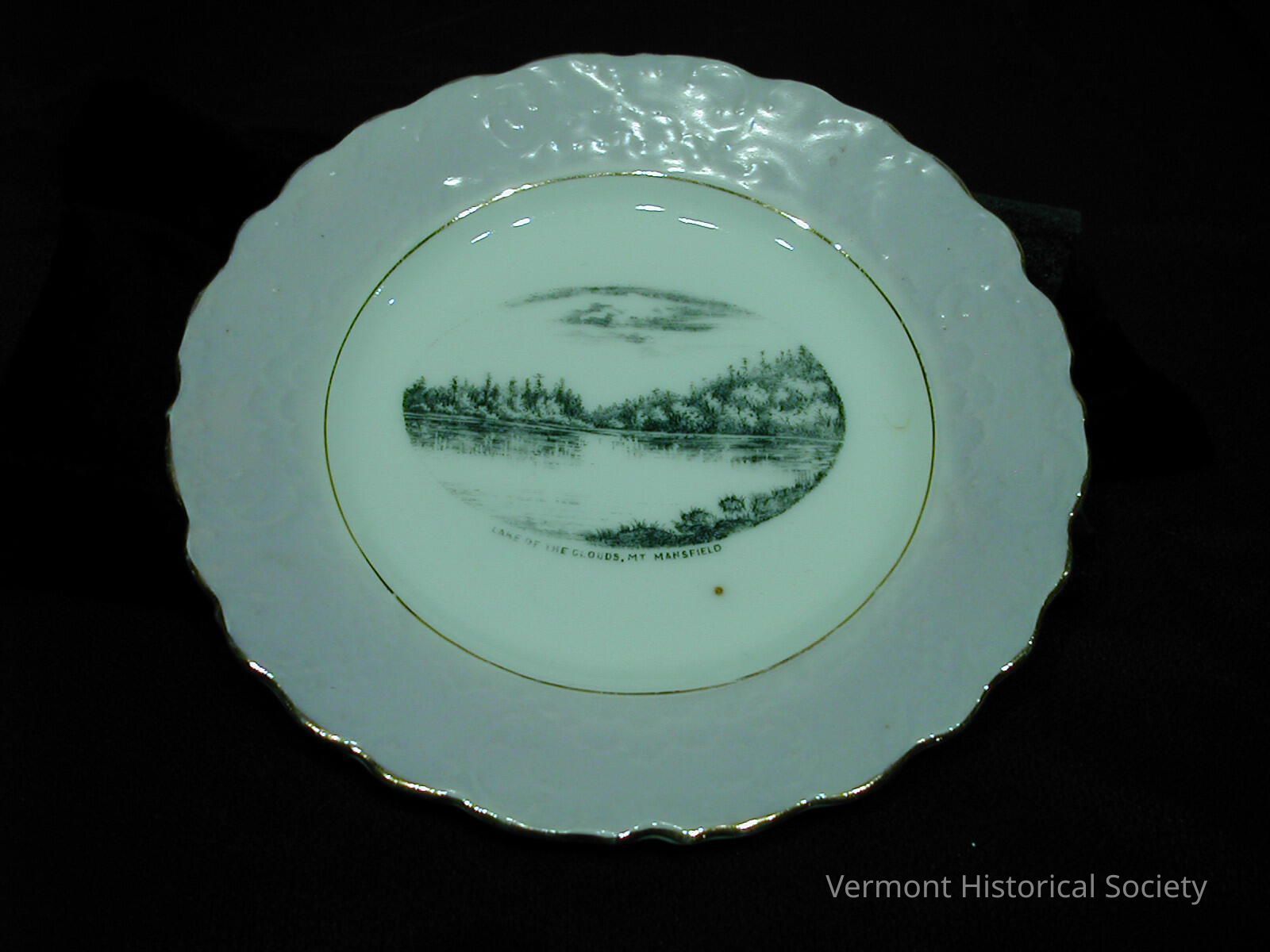 Saucer with scalloped edge and lavender colored border. The center is printed with an engraved image of a lake surrounded by trees. The image is labeled, "LAKE OF THE CLOUDS, MT. MANSFIELD". The reverse has the mark, "MADE IN GERMANY / PIKE & BENSON STOWE, VT.Context