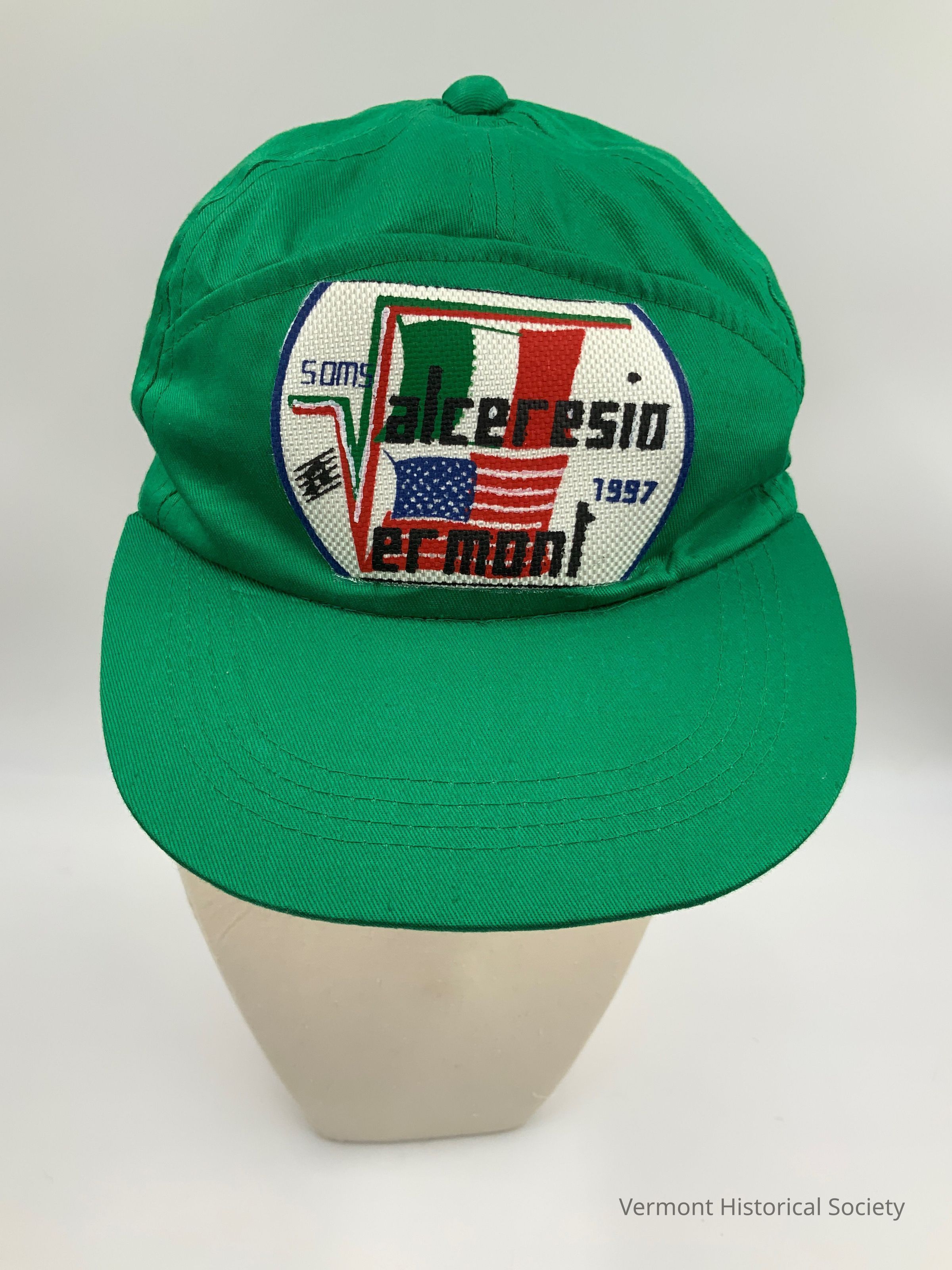 This baseball cap is made of Kelly green cotton and features a patch above the brim. The patch is red, green, and white and displays the text "Valceresio Vermont 1997" with the Italian and American flags in the background. Inside the cap, there is a tag that provides information about the fabric content and size, which is measured using the Italian system. On the top of the cap's crown, there is a covered green button, and there are two round metal vents for ventilation. At the back of the cap, there is a plastic strap that allows for adjusting the size.Context