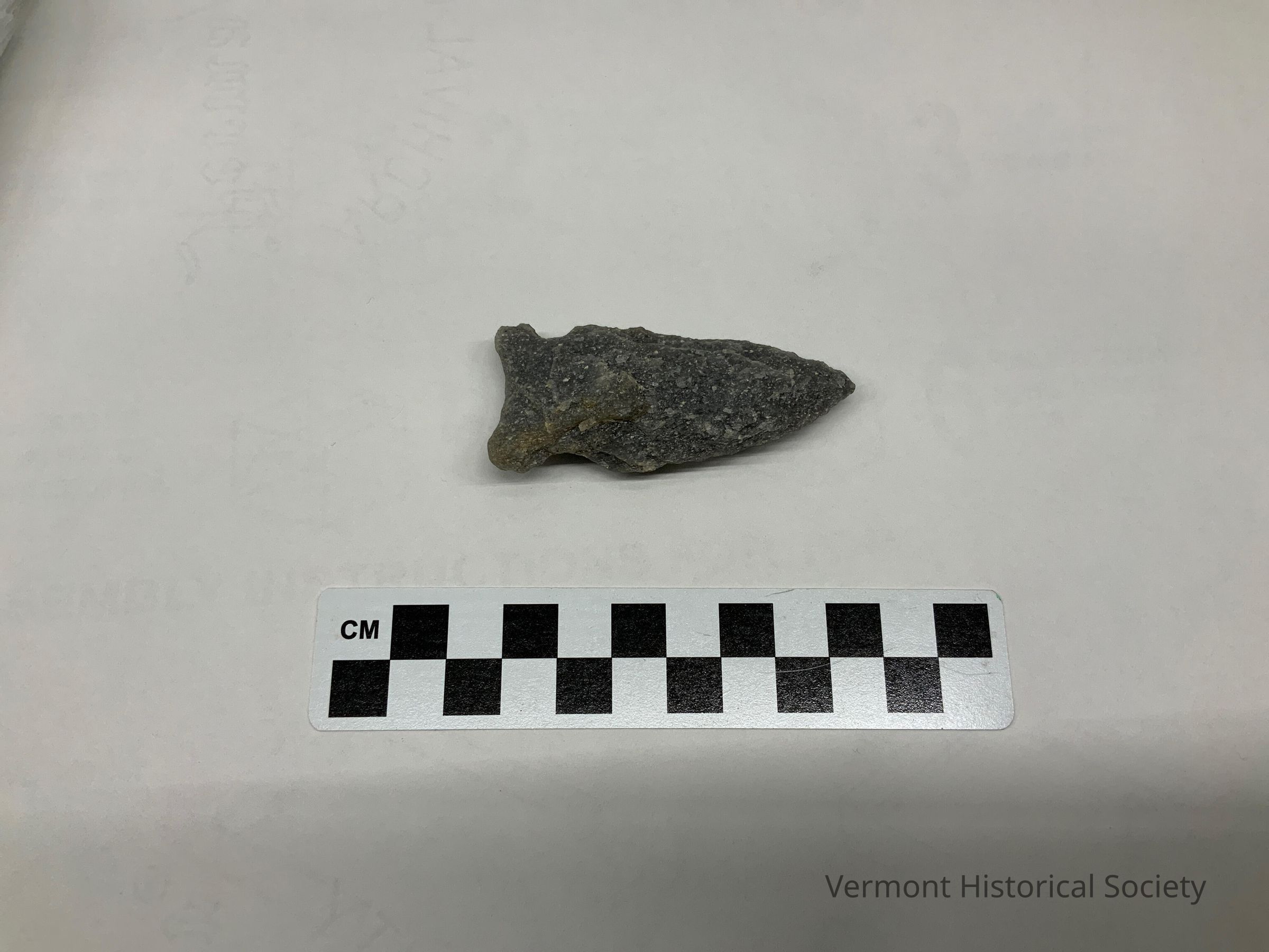 Gray chipped stone projectile point with side notches. The base curves inward, and the blade edges curve outward. One side is rounded.Context