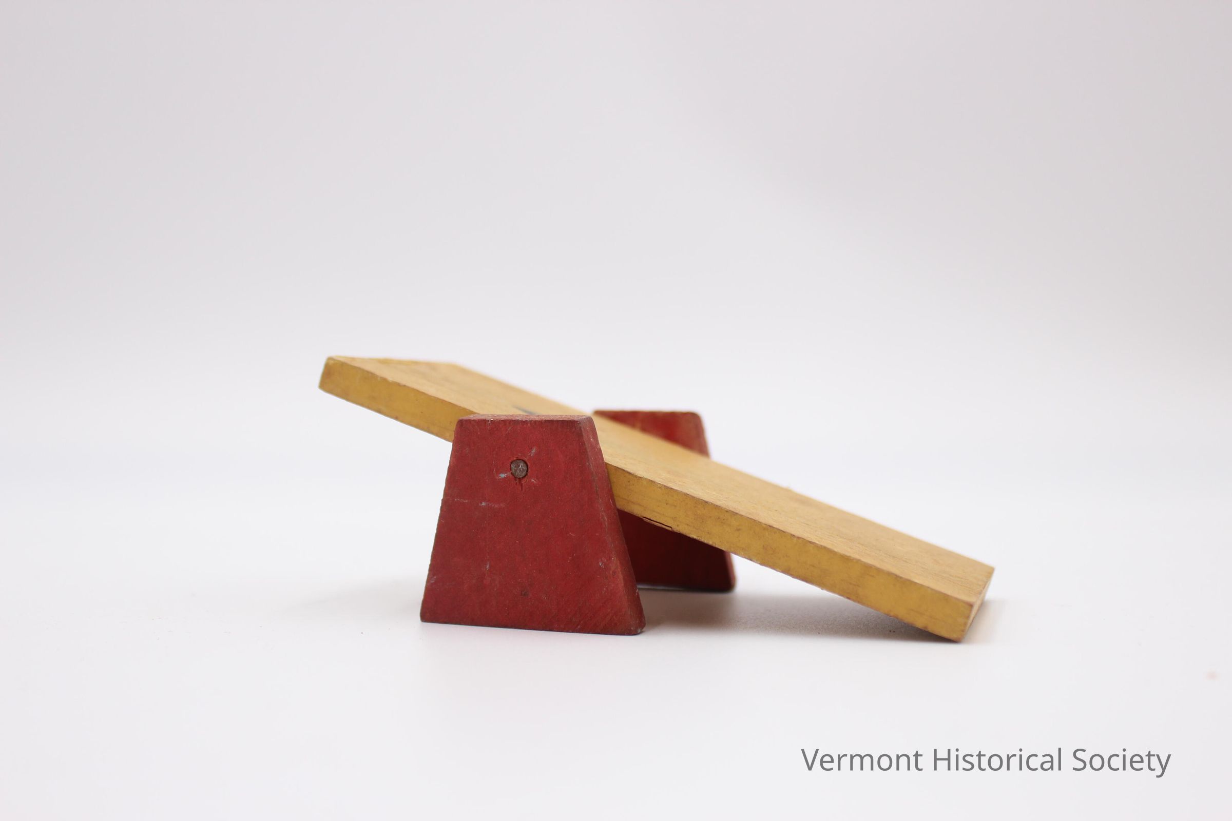 Wooden putting hazard consisting of a board nailed between two wedges. The board is nailed in such a way as to be hinged, like a seesaw. The center plank is painted yellow and the side wedges are painted red. The number 4 is painted on the top of the center piece.Context