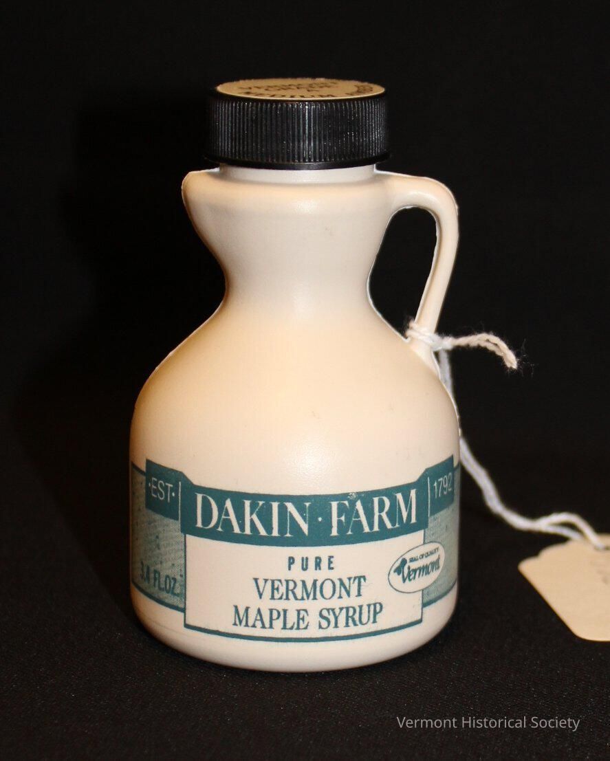 Shaped plastic maple syrup jug. The jug is tan with green lettering on the front that reads, "DAKIN FARM / PURE / VERMONT / MAPLE SYRUP" in the center. The panel on the left reads, "EST / 3.4 FL. OZ." and the panel on right reads, "1792 / Seal of Quality / Vermont." Printed in a box on back: "OUR PURE VERMONT MAPLE SYRUP" with information about their processing procedure, address, and other related information. The black plastic cap has white label reading: "VERMONT/ GRADE A/ MEDIUM AMBER"Context