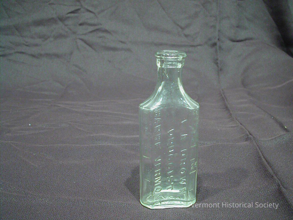 Clear glass medicine bottle with the molded inscription, "E. A. DROWN DRUGGIST, BARRE, VERMONT". The sides of the bottle are marked with measuring lines.