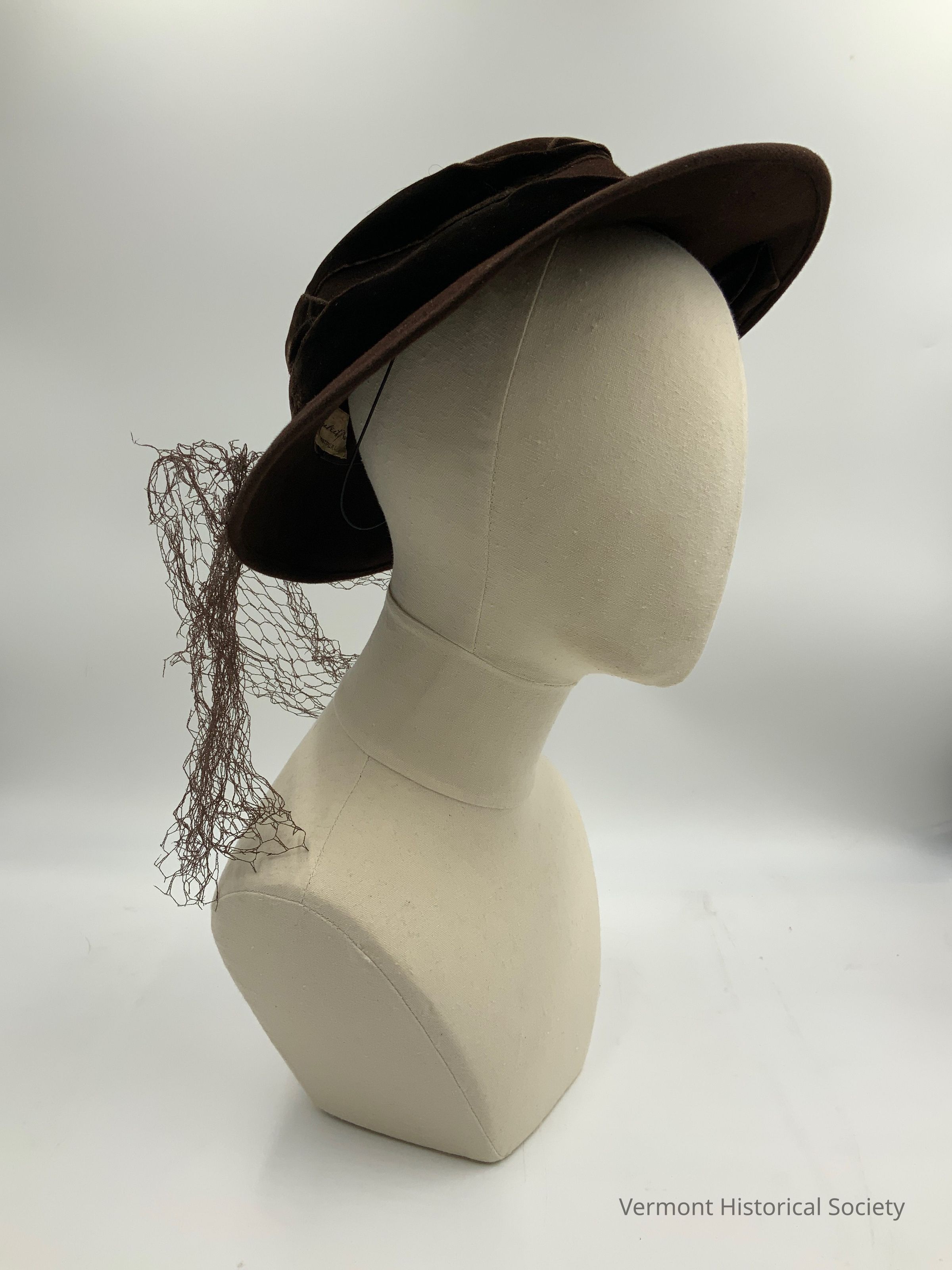 Brown felt hat with a brim all the way around. It has a low crown that is decorated with a brown velvet ribbon. Remnants of brown netting are attached to the back. There is a black elastic loop attached to the interior to secure the hat to the wearer's head. A label inside reads, "Elizabeth G. Cross MONTPELIER, VT."Context