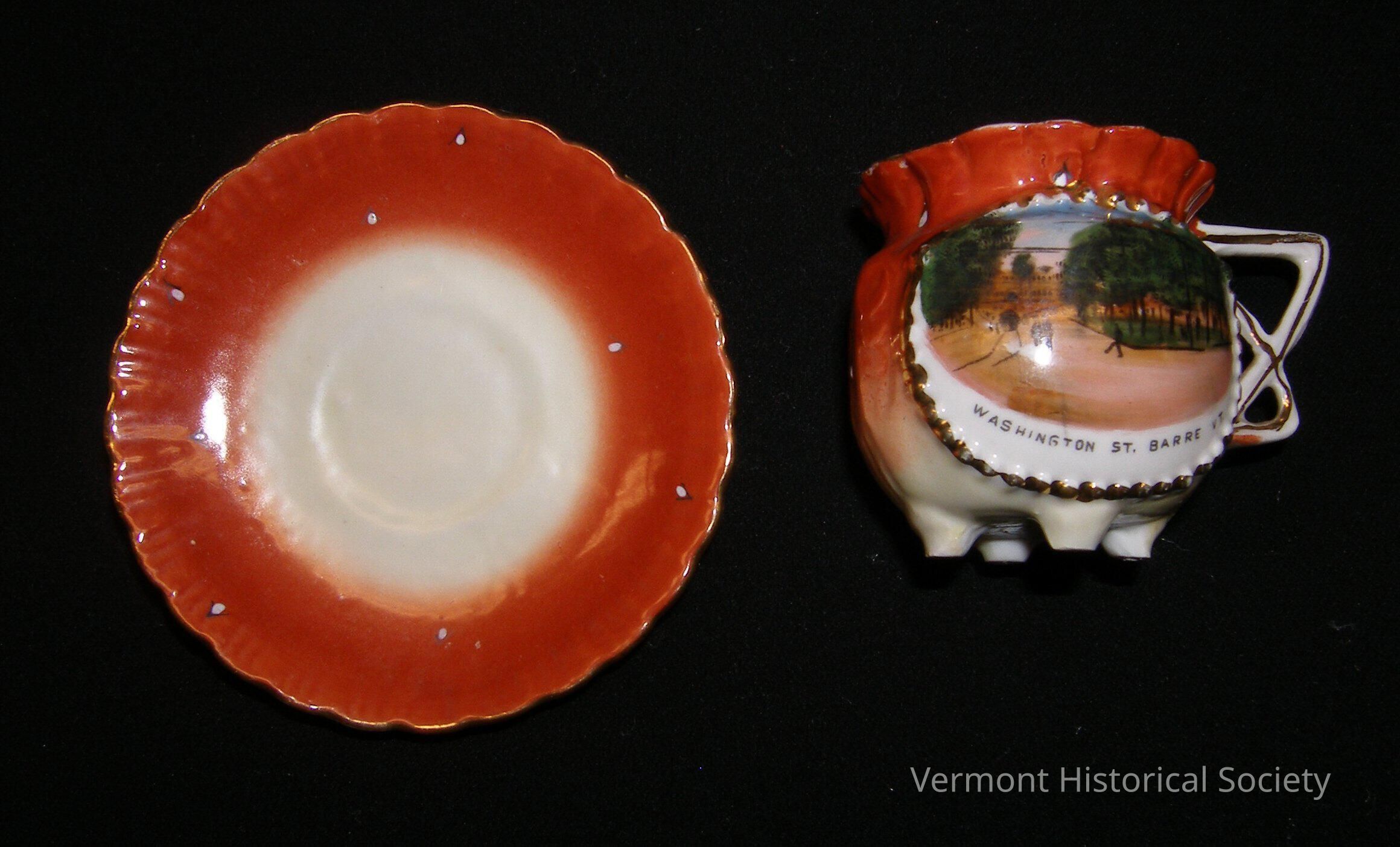 Porcelain demitasse saucer painted red on the rim and white in the center. The red is dotted with white and black spots, resembling seeds. The scalloped edge is heavily gilded.