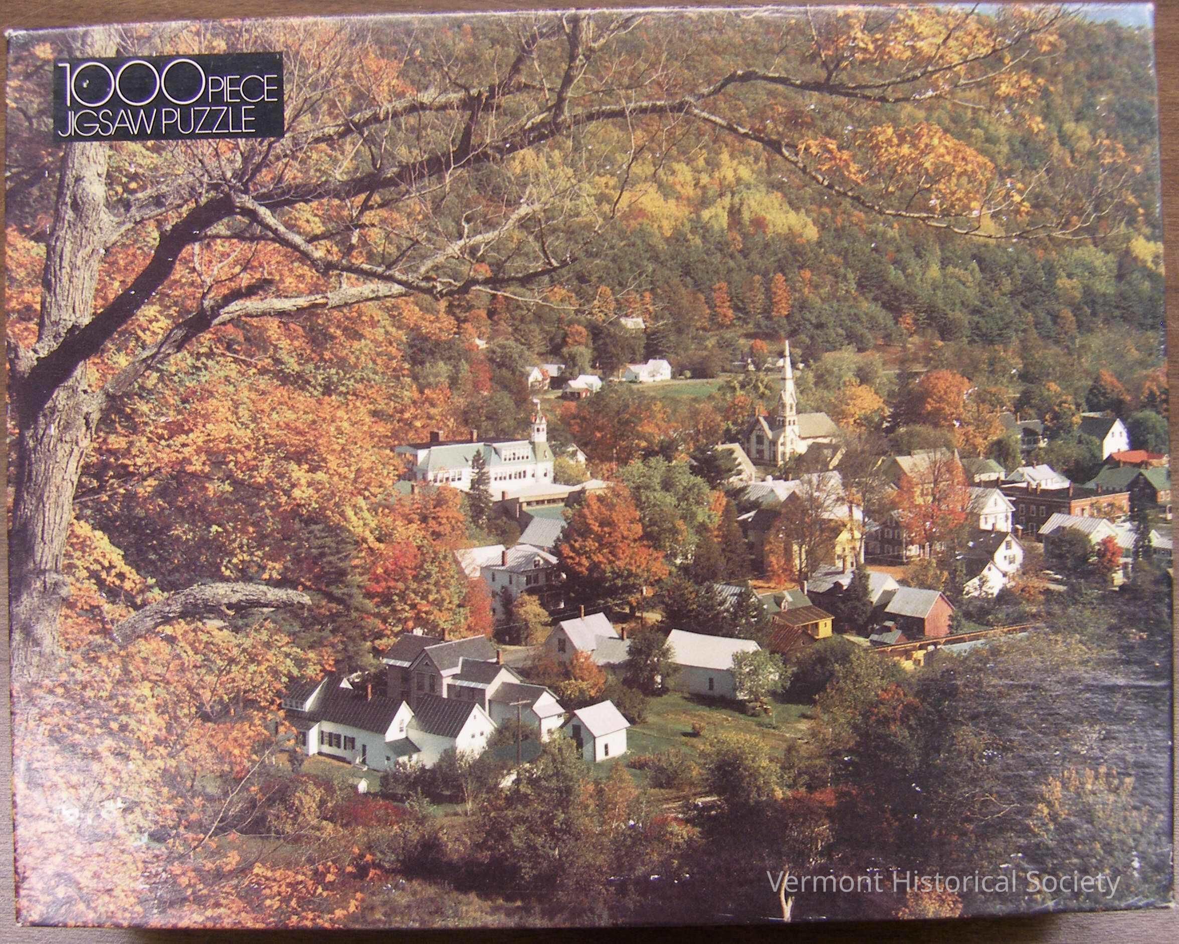 Boxed 1000-piece jigsaw puzzle. The exterior of the box is printed with the same image as the assembled puzzle: a photograph of a town set in a valley in the autumn (Royalton, Vermont).Acquisition