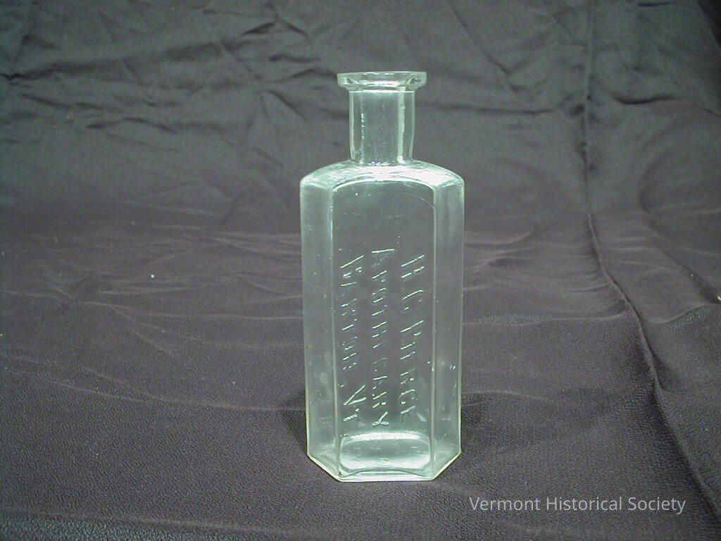 Clear glass medicine bottle with three flat sides on the front half and one round side on the back half. The center flat side has the molded inscription, "H. C. PIERCE APOTHECARY BARTON, VT."