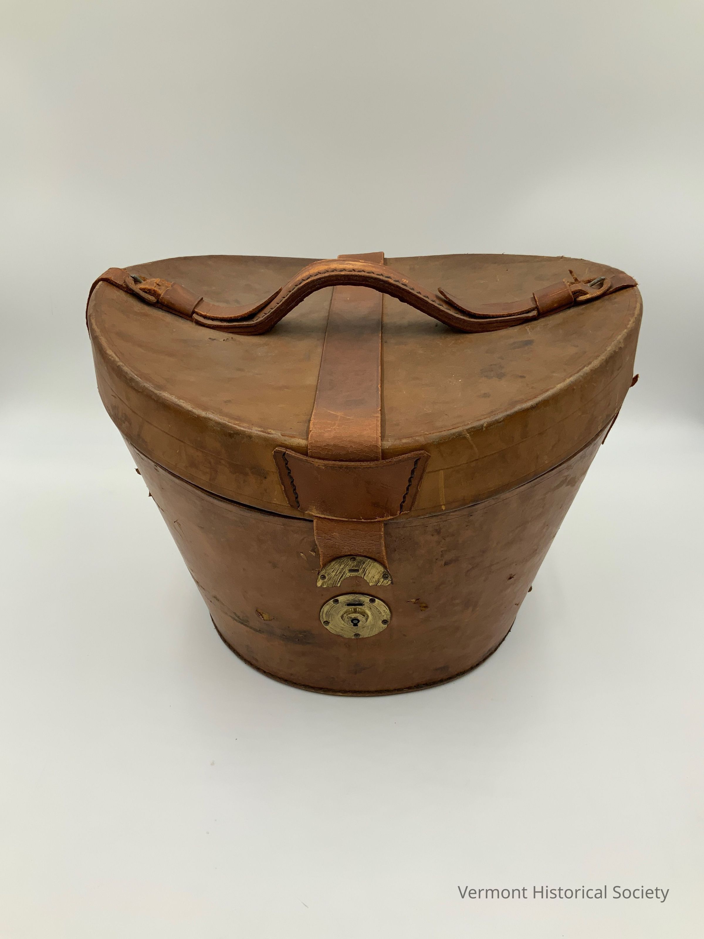 Shaped leather travel case for a hat. The case has a round base, and the sides flare outward to the concave lid. A leather strap forms a handle across the width of the top. Another leather strap lays across the lid perpendicular to the handle and hangs over the front side to insert into a brass clasp.