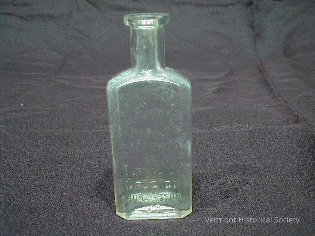 Clear glass medicine bottle with the molded inscription, "DIAMOND FLAVORING EXTRACTS PREPARED BY BURLINGTON DRUG CO BURLINGTON VT." The bottom of the bottle is labeled, "102".