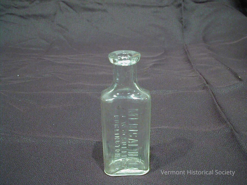Small clear glass medicine bottle with the molded inscription, "MEDICAL HALL J.W. O'SULLIVAN BURLINGTON, VT."