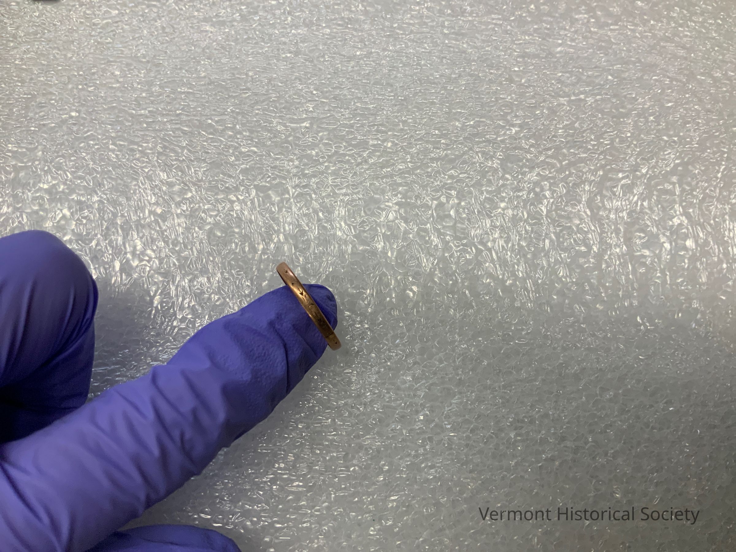 Narrow bronze ring engraved around the outside with a decorative arrow pattern.
