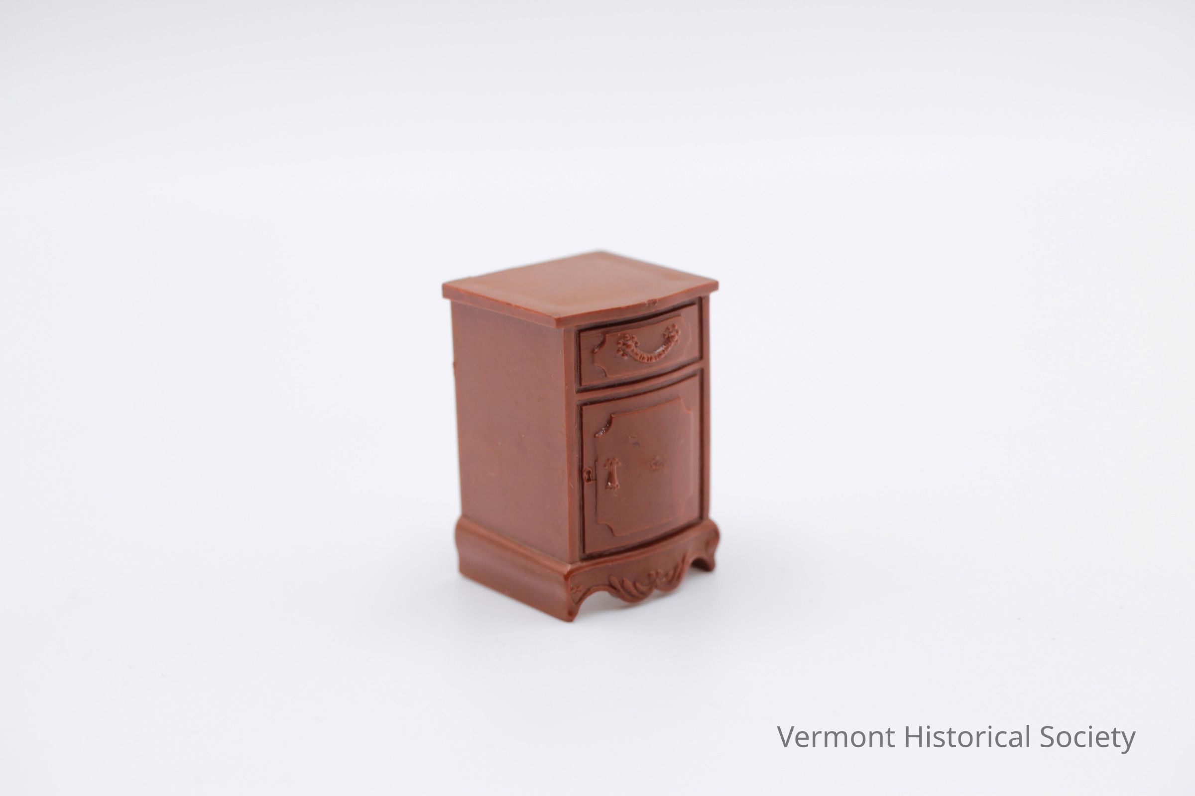 Miniature brown plastic nightstand. The front is molded with a drawer front at the top and a cabinet door at the bottom. There is no back, leaving it hollow. The interior is molded with the word, "Reliable".Context