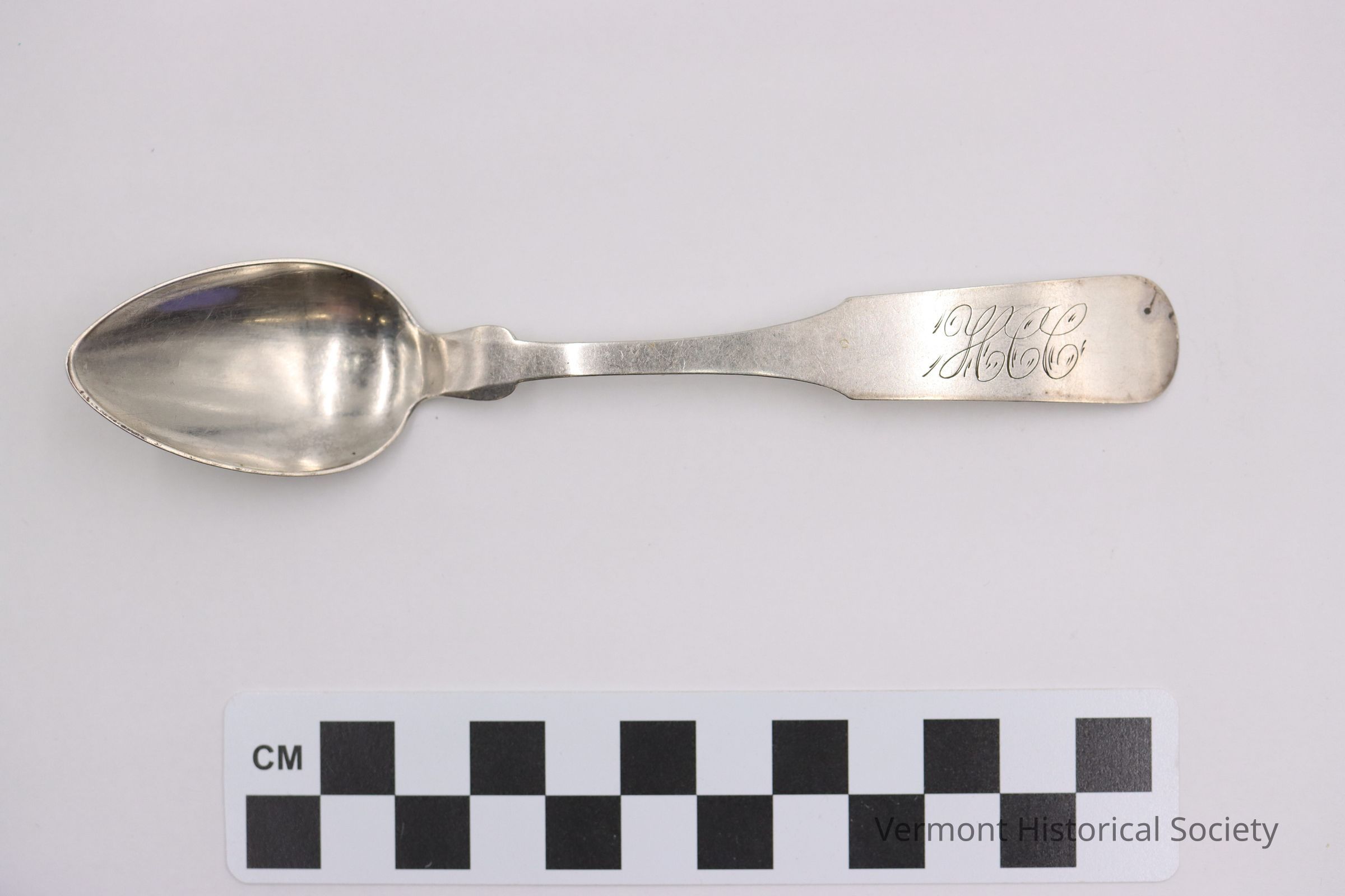 1 of 6 matching coin silver teaspoons. It has a downturned fiddle handle with medium shoulders. The handle is engraved with the initials HCC. The back of the handle is marked "J.S.ABBOTT." within a rectangle.