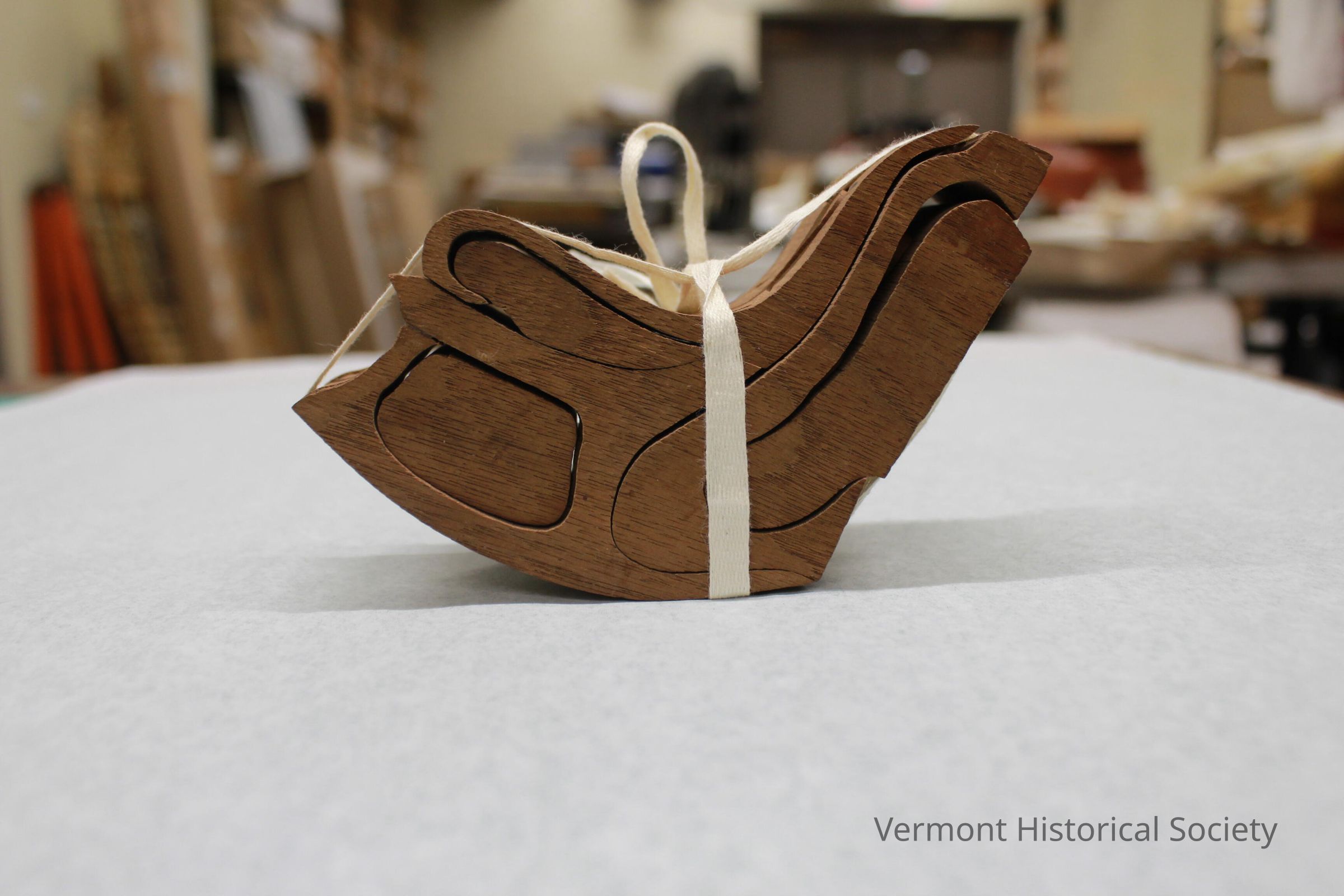 Three-dimensional wooden puzzle consisting of 14 pieces that join together in the shape of a rocking chair.
