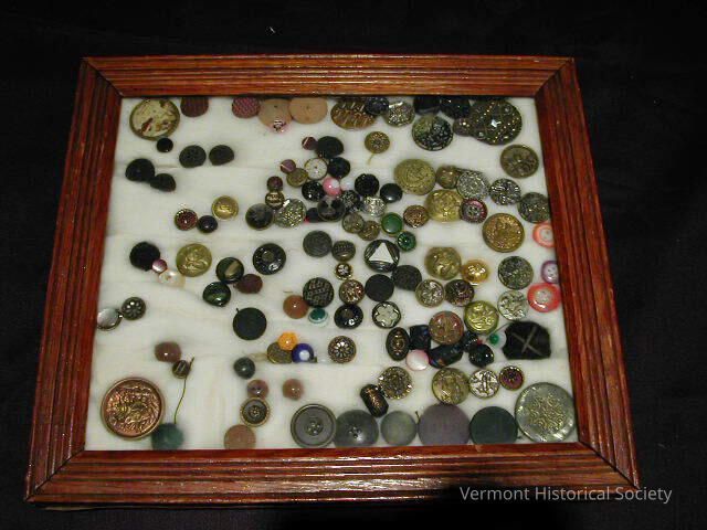 Shadow box frame containing several loose buttons. The buttons are pressed against the glass with cotton batting, almost holding them in place. Buttons are are clothing fasteners, but range from decorative buttons, to military buttons, to utilitarian buttons.