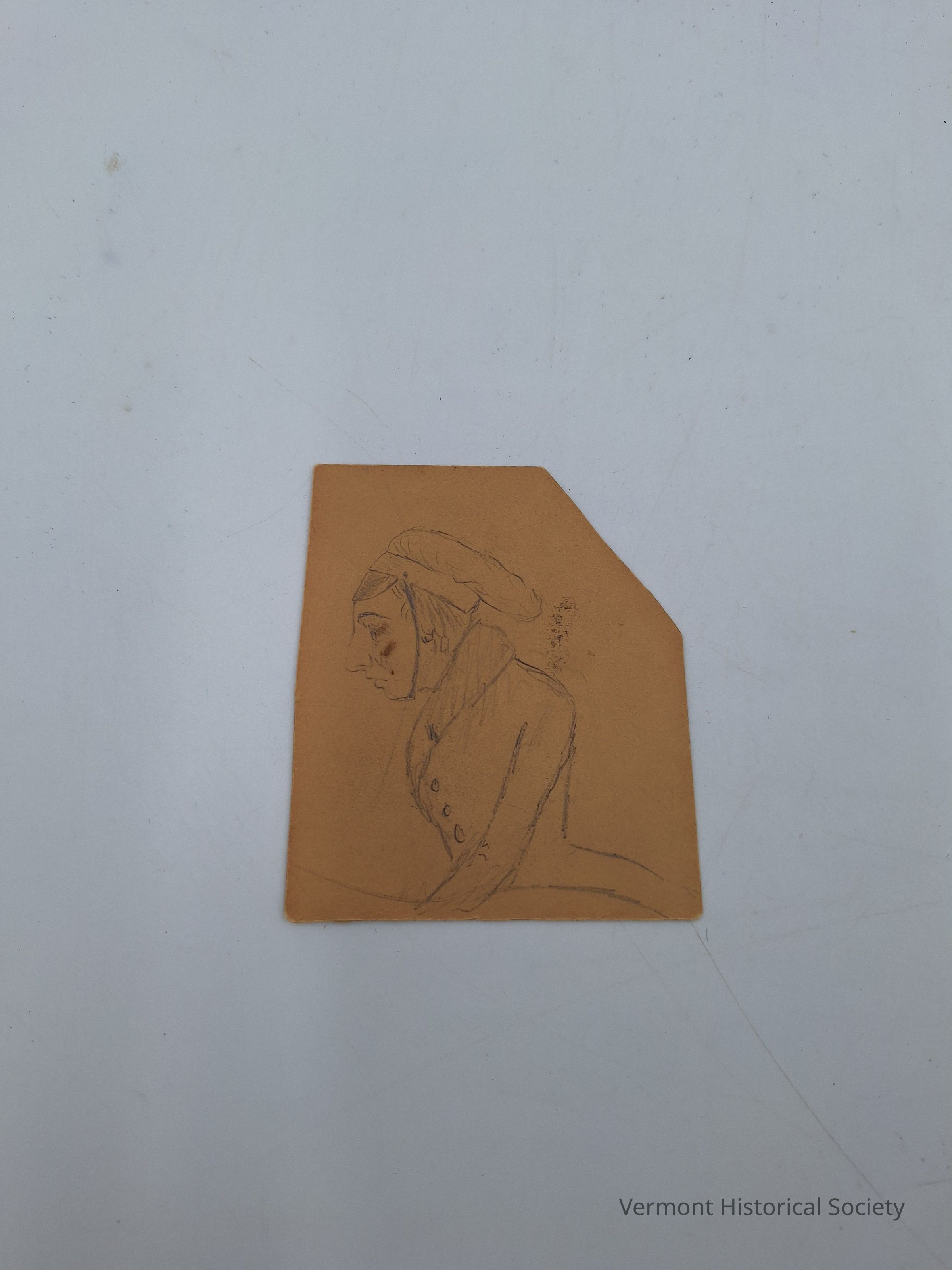 Set of pencil sketches titled "Personalities" by William Morris Hunt. Each sketch is on a small scrap of paper or card stock that has yellowed significantly with age. The first sketch (a) is an older woman in profile wearing a collared button-down coat and a floppy cap around her head. The back of the sketch reads "Wm M Hunt 1839" in pencil. The second page (b) has four sketches glued to it: the top one is a dog with medium-length dark and light fur, one paw raised and tongue sticking out. Below are two landscapes, one of an arched stone bridge over a waterfall with a framed pencil line around it, noted "Falls + Bridge" in the lower right, the second of a stone tower surrounded by trees and bushes with "AW Del." (?) in the lower right corner. The final sketch shows a horse's head in profile. The back of the paper matting reads "Wm M Hunt" in pencil.Type of Drawing
