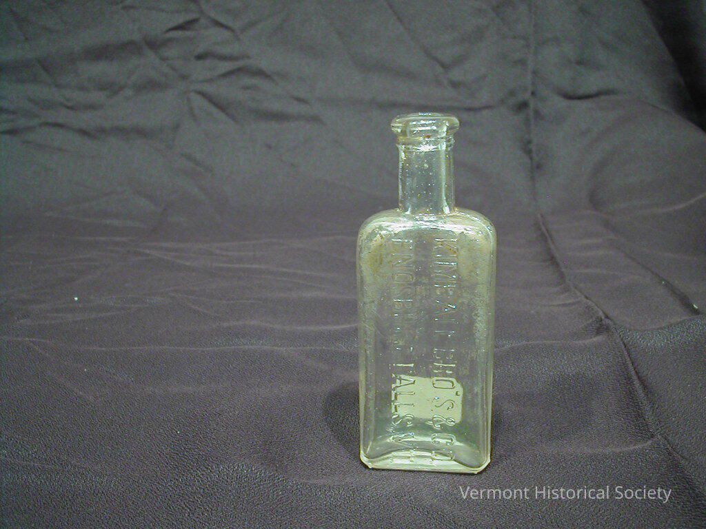 Clear glass medicine bottle with the molded inscription, "KIMBALL BRO'S & CO. ENOSBURG FALLS, VT."