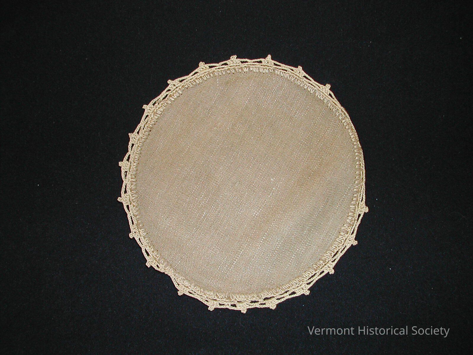 Round, plain-woven linen doily with a narrow, crocheted border.Context