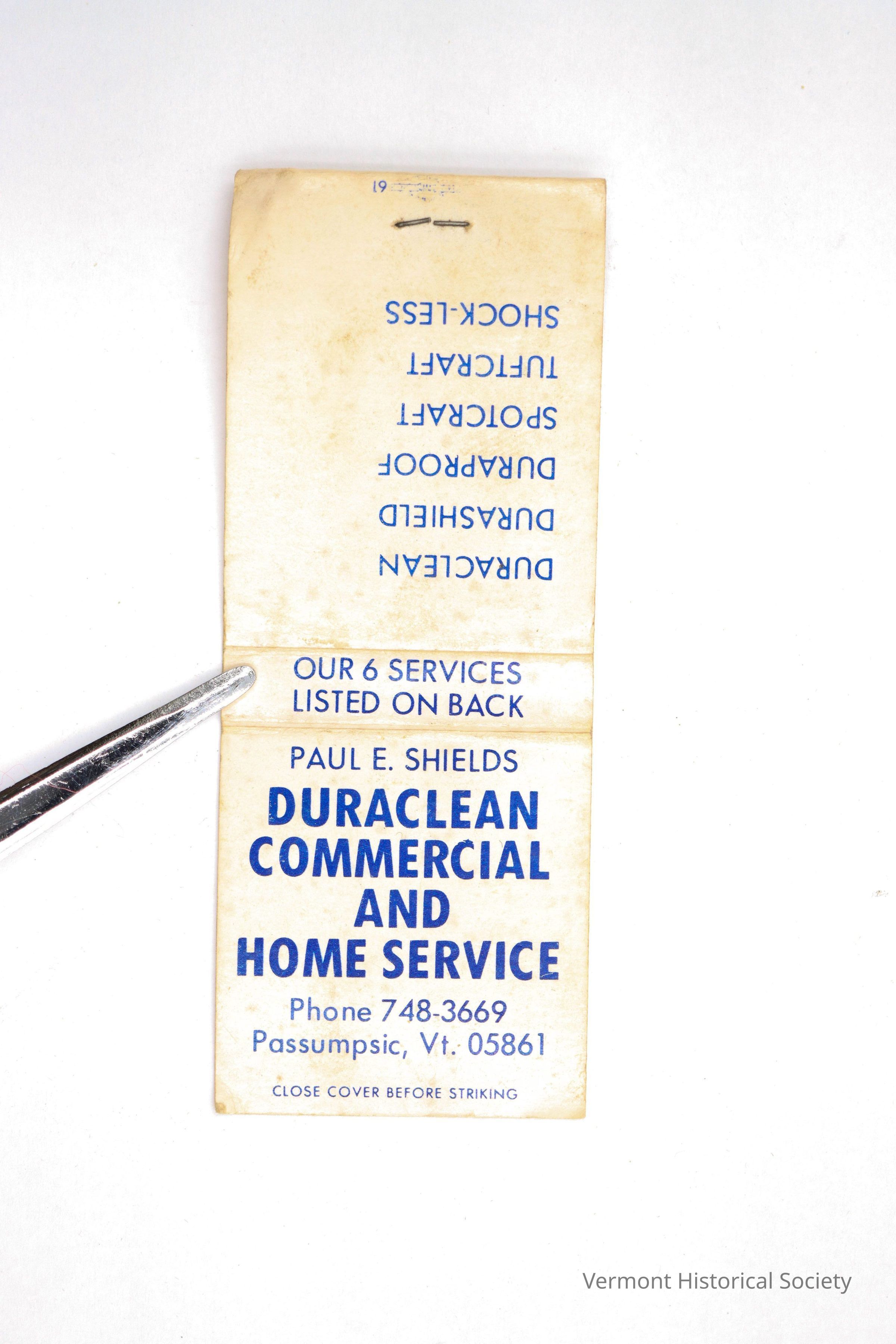 White cardboard bifold matchbook. The front flap is printed with the inscription, "PAUL E. SHIELDS DURACLEAN COMMERCIAL AND HOME SERVICE Phone 7483669 Passumpsic, Vt. 05861."