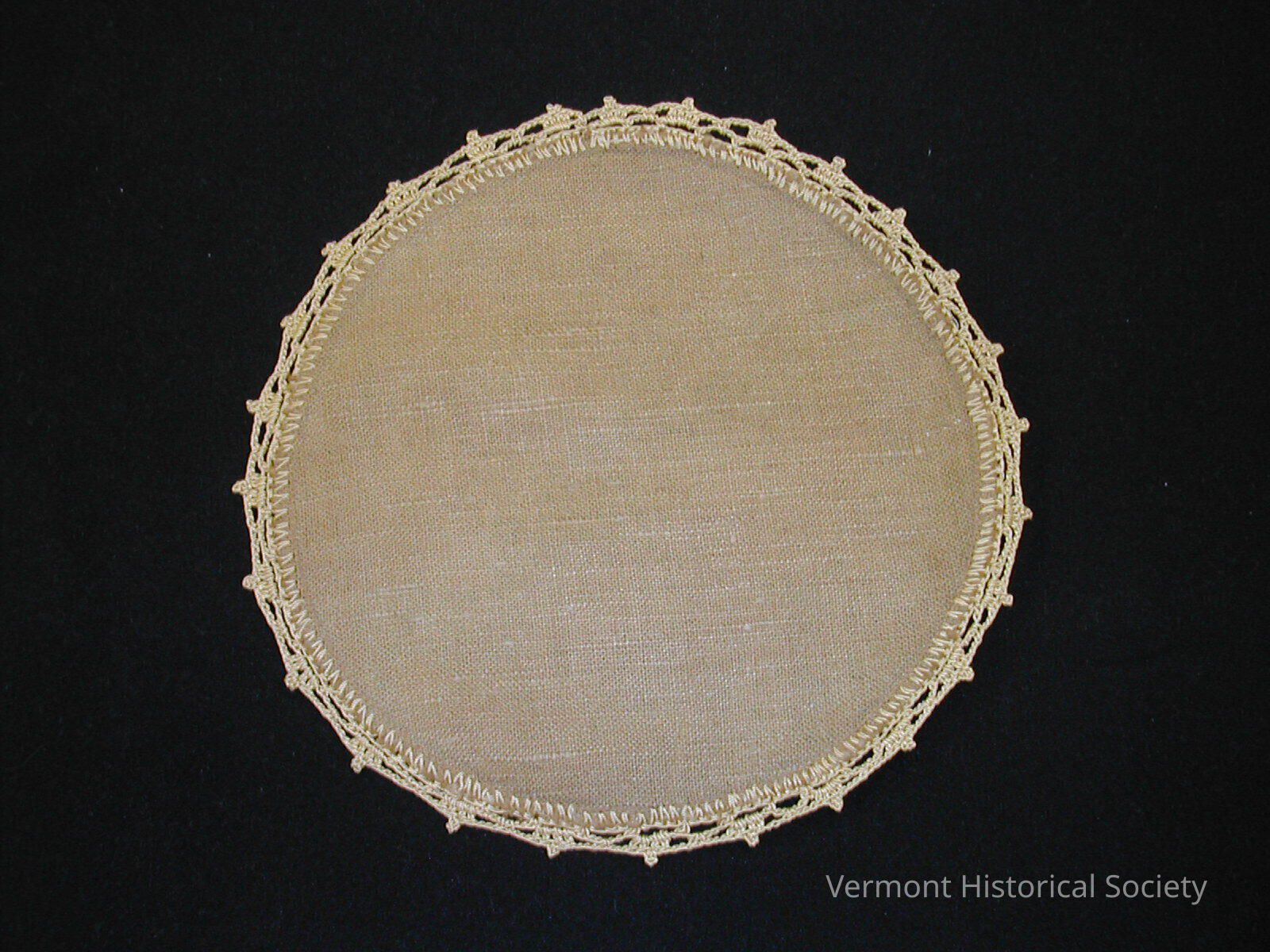 Round, plain-woven linen doily with a narrow, crocheted border.Context