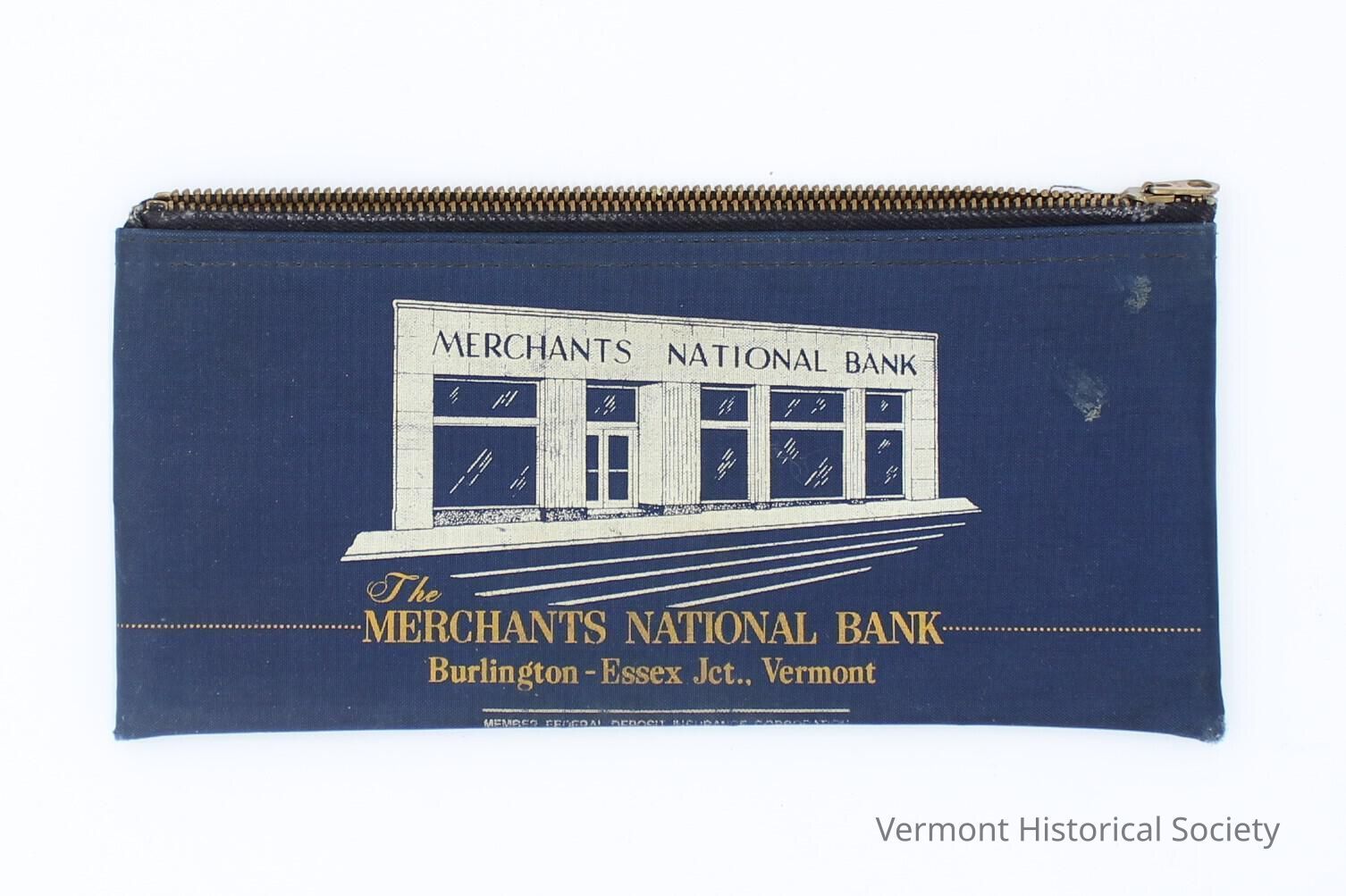 Blue deposit bag with heavy, metal zipper along the top. The front is screen printed with an image of the bank's storefront in white and the inscriptions "The/MERCHANTS NATIONAL BANK/Burlington - Essex Jct., Vermont" in yellow and "MEMBER FEDERAL DEPOSIT INSURANCE CORPORATION" in white.